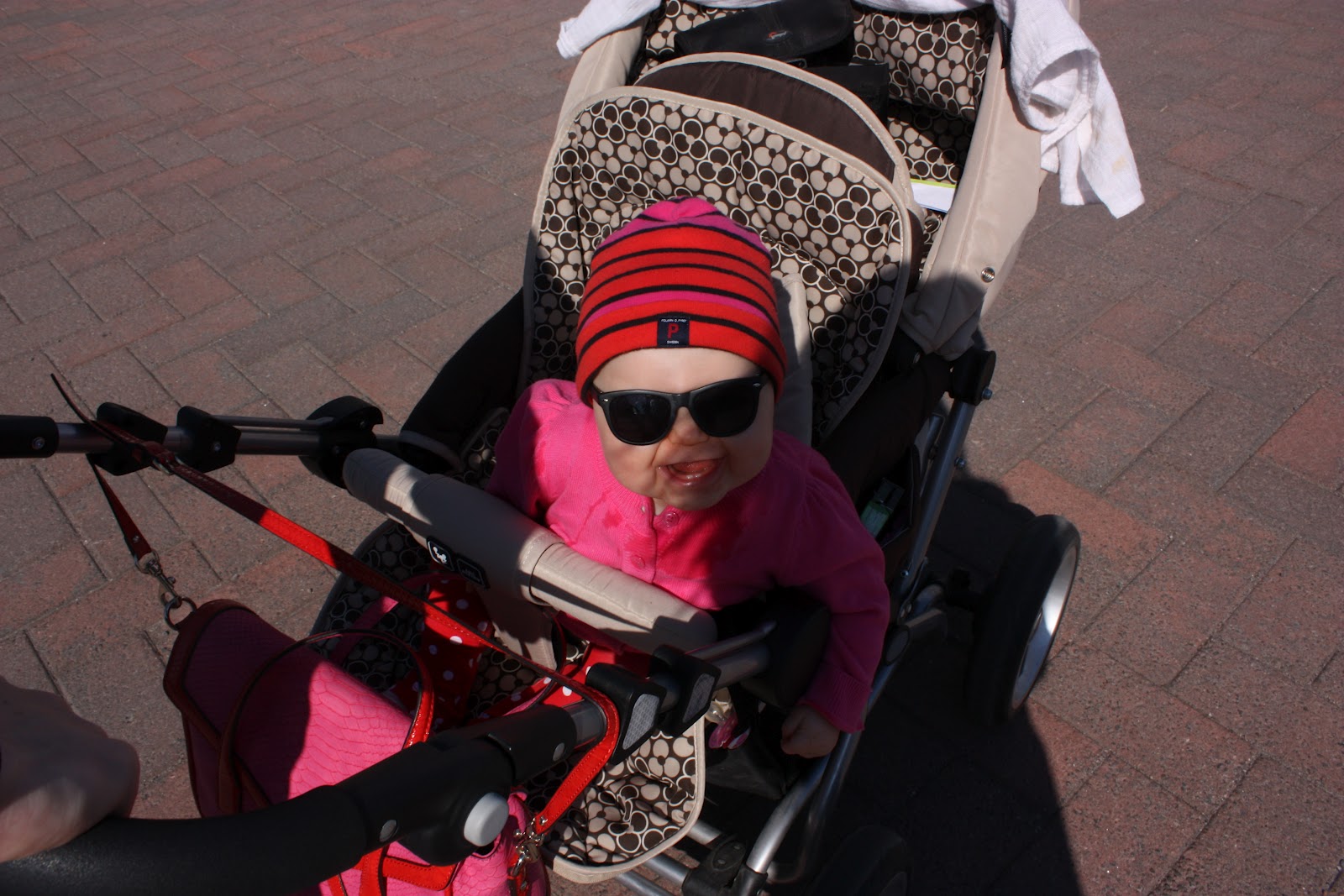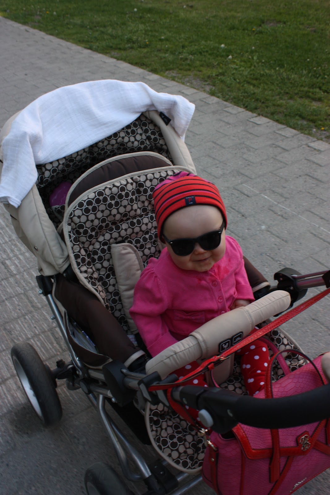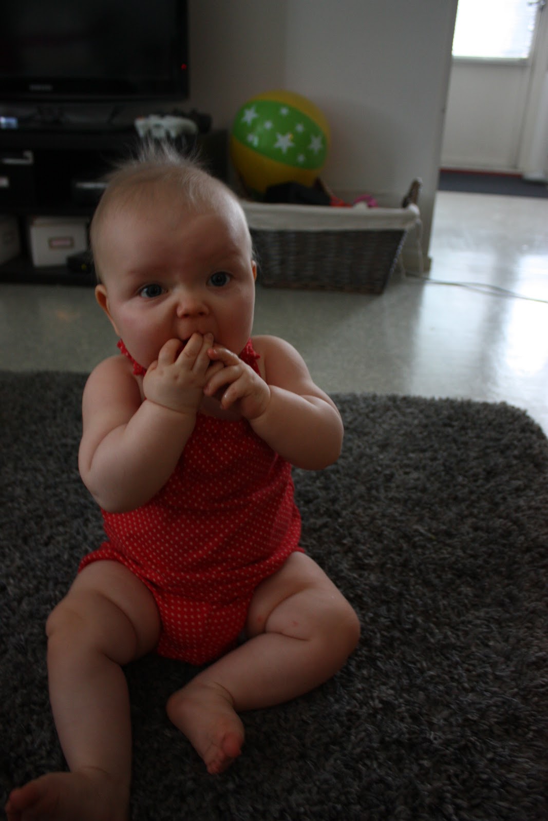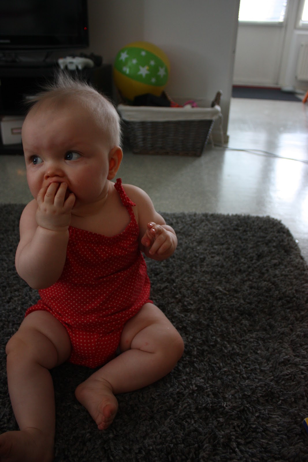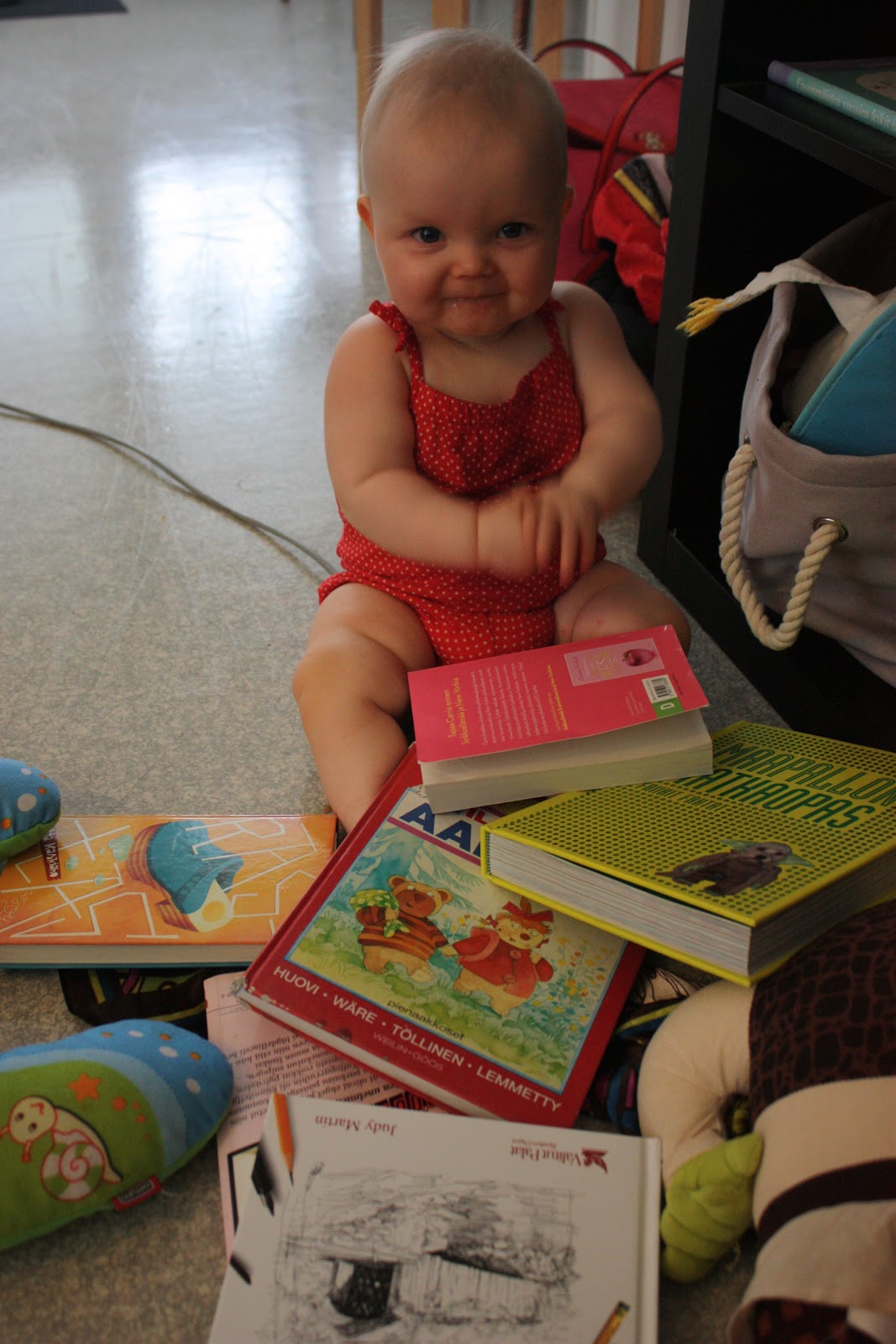 Mutta mitäs Tirriskälle kuuluu? No meidän pikkuneidistä on kehkeytynyt kunnon naispuolinen Veikka Gustafsson, jokapaikkaan on pakko kiivetä. Jos ollaan vaikka lattialla niin Tiara kiipeilee kokoajan mun päälle ja mun yli, kirjahyllyssäkään ei pysy tavarat enää keskihyllyllä kun reviiri on laajentunut alahyllyltä korkeammalle. Tiara tuntuu nauttivan kovasti siitä että kiipeää esteiden yli, lelukaarenkin neiti kaataa lattialle ja sitten kömpii yli ja jokapaikkaa vasten on pakko nousta karhukävelyasentoon/polvilleen seisomaan. Kai sekin on jonkinnäköistä tukea vasten seisomaan nousua, vaikka Tiara onkin vielä kumarassa mutta jos pylly kumminkin on ylhäällä lattiasta? Istumaan neiti myös nousee kokoajan eikä makuullaan oikeastaan enää viihdykään, mutta miksi pitäisikään, johan se on makoillut yli kahdeksan kuukautta! Hauskaa Tiaralla tuntuu olevan ainakin ja se on hyvä jos mikä! Tässäpä vähän kuvia eiliseltä: