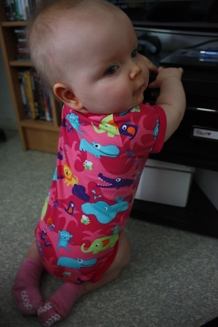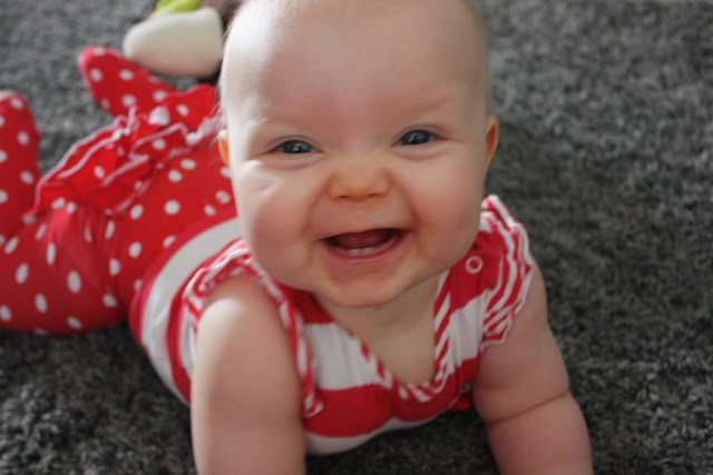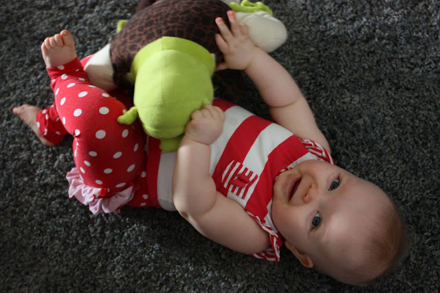 Oli myös tosi hassua kun neuvolalääkäri kysyi että joko Tiara nousee istumaan itse, niin sanoin että ei nouse että pitää vielä toisella kädellä kiinni lattiasta mutta melkein osaa jo nousta. No eiköhän sitten neiti heti ensimmäisenä meidän päästyä kotiin noussut itse istumaan ja on tehnyt sen jo kolme kertaa tänään! Viimeksi meillä kävi 7kk -neuvolassa niin että täti kysyi joko Tiara osaa ryömiä ja sanoin että ei niin samana päivänä tytsy rupes ryömimään!