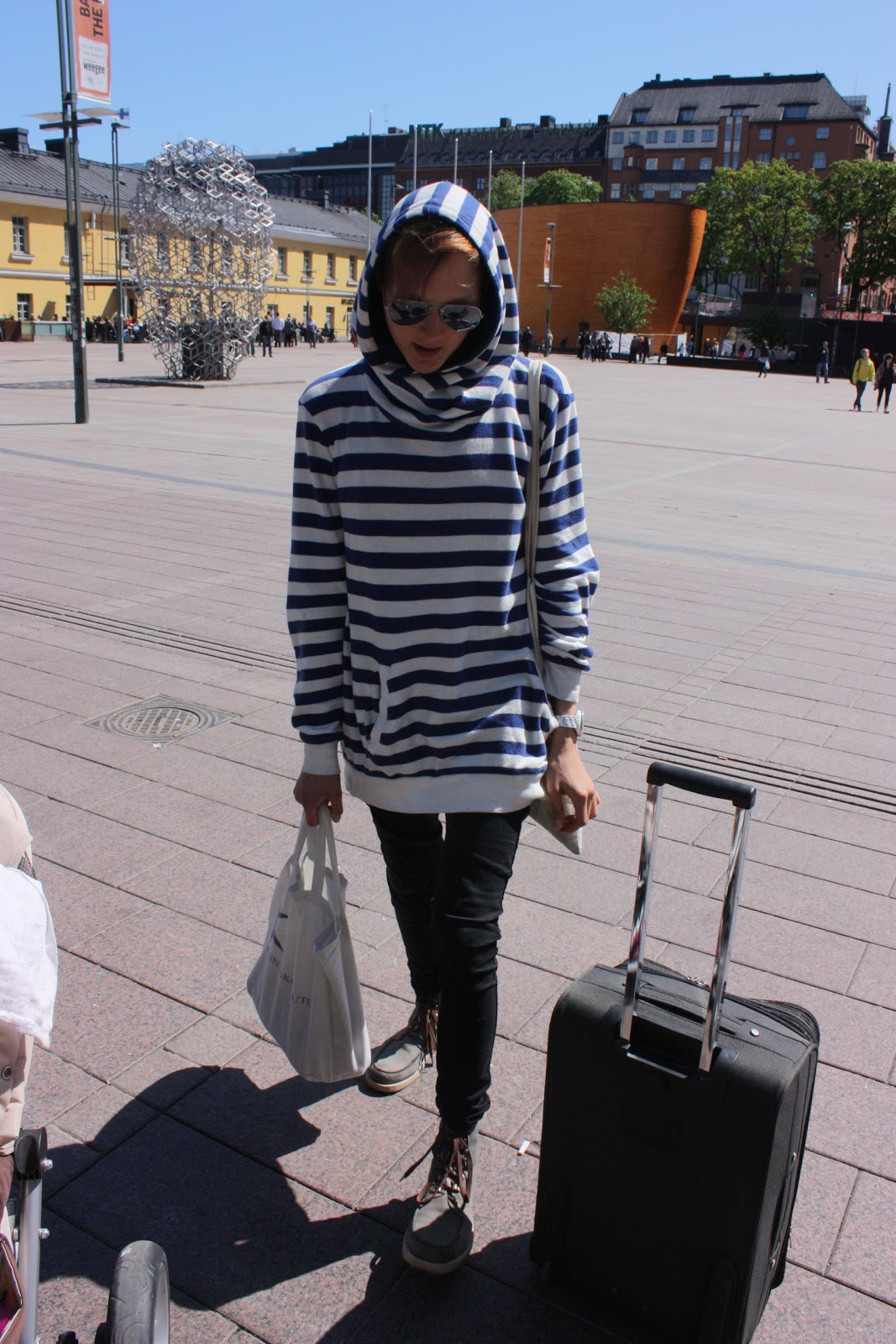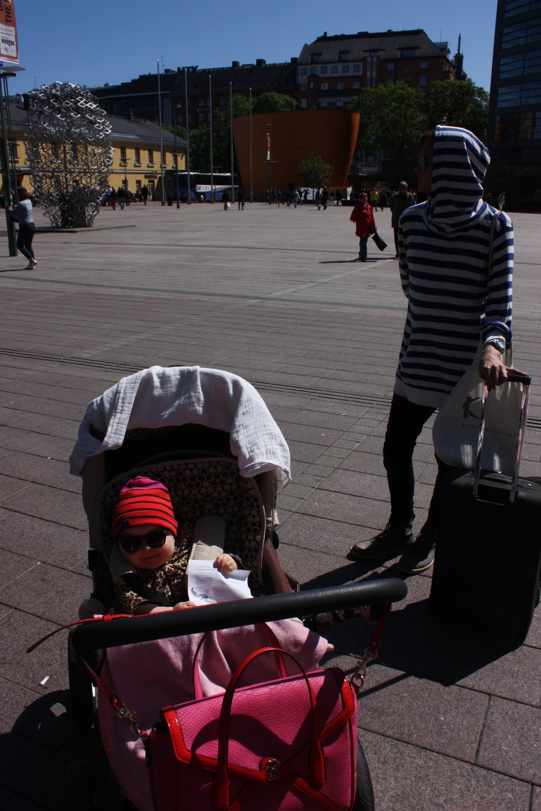 Mä haluaisin myös kovasti käydä ainakin Korkeasaaressa ja ehkä Stadikalla uimassa ja ottamassa aurinkoa, siellä olis ainakin lämmintä vettä. Tasan kahden viikon päästä me matkataan Ouluun lomalle, lentoliput on jo ostettu ja viivytään siellä Juhannusviikon loppuun asti. Mua jännittää jo nyt se lento että mitä jos Tirriskän korviin sattuu, mut onneksi lento ei kestä kuin tunnin (vai onkos se vielä vähemmän?). Jos mä annan vaikka laskun aikana maitoa neidille niin eikös sen pitäisi vähän tasata niitä paineita korvissa kun nieleskelee? Sopivasti onnistuin lörpöttelemään ihan asioiden vierestä joten nyt taitaa olla oikea paikka laittaa kuvat tiskiin!