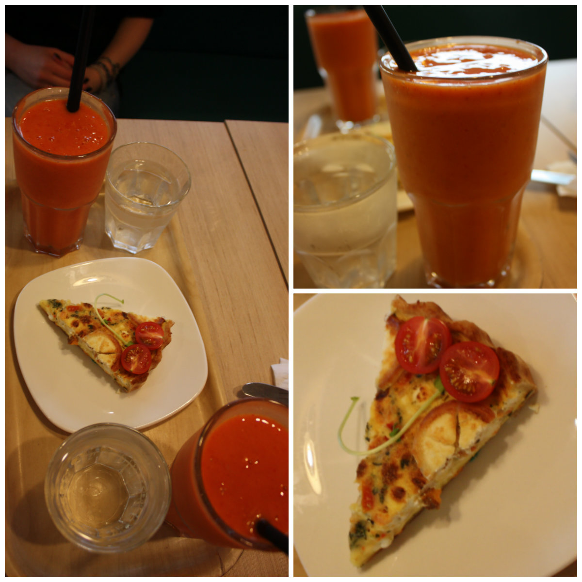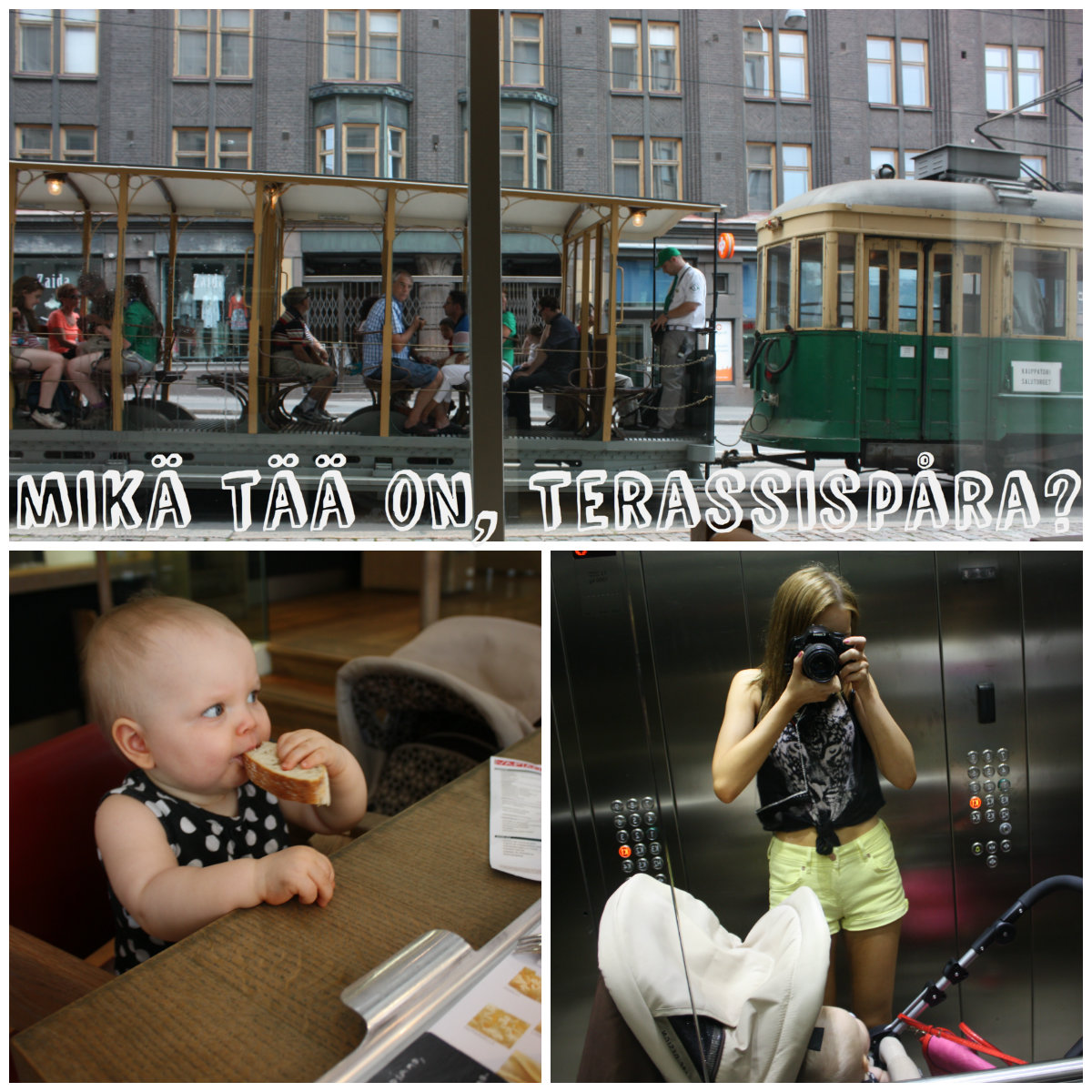 Mutta palatakseni aiheeseen, me suunnattiin lounaan jälkeen neidin kanssa keskustaan pitkästä aikaa ja mentiin kahvittelemaan Tirriskän kummitädin kanssa sekä moikkaamaan mun kaveria Ringoa. Mä olin liikenteessä pelkän meikkipohjan, kulmakarvojen ja huulipunan voimin tästä ah-niin-ihanasta silmätulehduksesta johtuen ja vaikka ensin olikin hieman alaston olo ilman silmämeikkiä niin nyt kun katson näitä kuvia niin en mä ehkä ollutkaan ihan niin alastoman näköinen? Mentiin Kampin Johtoon istuskelemaan ja tilasin ihanaa kasvis-vuohenjuustopiirakkaa sekä naminamin mango-mansikka -fruitien. Tiara höpötteli iloisena meille koko kahvittelun ajan omilla leluillaan leikkien ja osoitti kovasti kiinnostusta mun fruitieta kohtaan kun se oli niin herkullisen värinen!