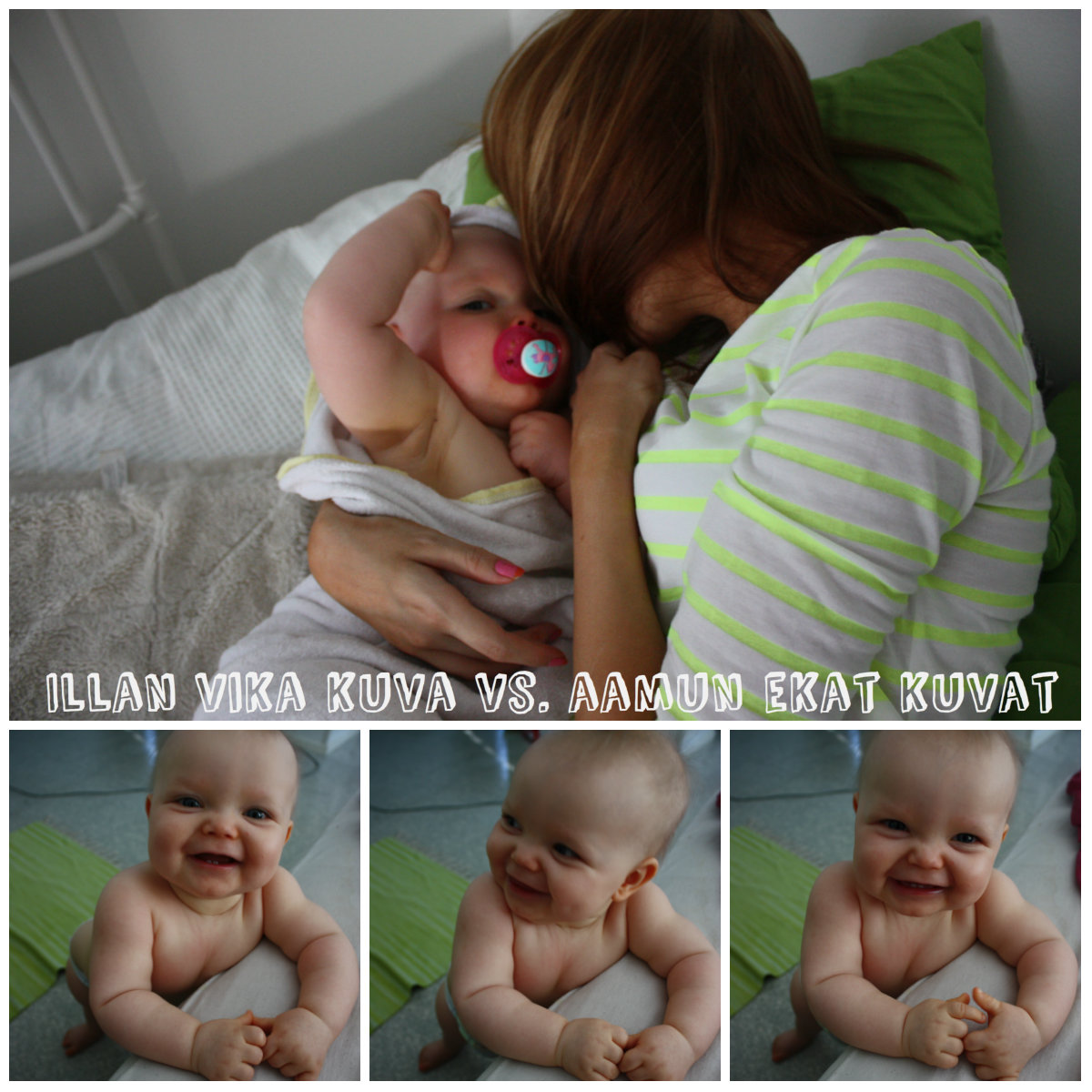 Tiistai-aamu valkeni maanantaita mukavammin ja herätessä oli kiva tietää että on mukavaa tekemistä tiedossa! Tiara nukkui hyvin yön ja aamulla lattialla istuskeli ihana pieni peittokääryle. Oli ihanaa juoda Oton kanssa aamukahvit rauhassa ja leikkiä koko perheen kesken piilosta. Oton lähdettyä töihin mä kävin pitkässä kuumassa suihkussa, Tiara on nimittäin ihan hulluna suihkuun! Tai no siihen että mä käyn suihkussa, vielä nyt 10kk iässäkin Tiara loikoilee sitterissä kylppärissä puoli tuntia ja höpöttää mulle kun oon suihkussa, eikä yritäkään päästä pois. Jos Tiaralla on paha mieli niin mä meen suihkuun ja sit Tiara on taas iloinen. Mistä tää voi johtua, onko mun tyttäreni luonnonoikku? Ja tää suihkujuttu on ollut aina, niin kauan kun mä jaksan muistaa niin oon ottanut Tiaran mukaan suihkuun ja ne on ollut meidän omia höpöttelyhetkiä. Onhan se mukavaa että on juttuseuraa kun hieroo shampoota päähän ja arvostava yleisö aplodeineen päivineen kun intoutuu vetämään suihkuserenadeja oikein olan takaa! Äidin ihana pieni hömppä suihkutonttu!