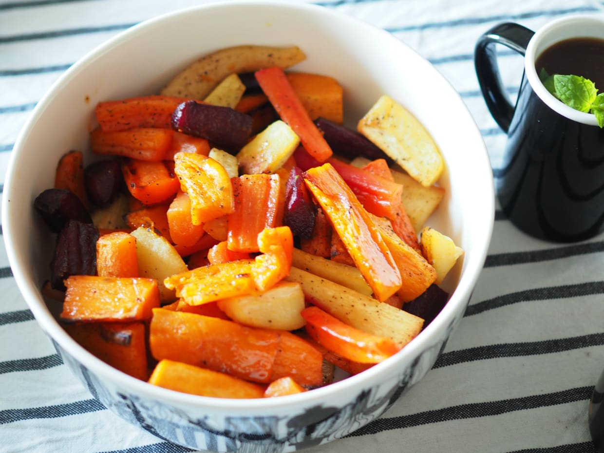 Mä tein nuo sillä tavalla että pilkoin, keitin viis minuuttia, sen jälkeen valelin öljy-hunaja-appelsiinimehuseoksella (tuoretta itsepuristettua mehua) ja rouhin pippuria ja suolaa päälle. Paistoin 225 asteessa noin puoli tuntia :)!