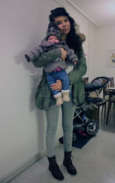 Tänään on ollu kyllä sen luokan hulinapäivä että huhhuh! On pakattu, siivottu, paketoitu viimesiä lahjoja, haettu autoa toiseltä puolen kaupunkia ja ties mitä kaikkea. Nona-kummitätikin kävi meitä moikkailemassa päivällä ja oli kyllä niin mukava nähdä. Onneksi on vihdoin päivä pulkassa ja enää ei odota muu kuin ah niin ihastuttava 506 kilometrin ajomatka Ouluun huomenna. Mutta eiköhän se mene nopsaan ja neitikin rakastaa nukkua turvaistuimessa; tänäänkin nukahti samantien kun turvakaukalon vyöt napsahti kiinni. Eiks se oo vähä niin että suurin osa vauvoista tykkää nukkua autossa mieluummin kun missään muualla. Mulla ei oikeastaan liiku päässä mitään hirveen fiksua enää tähän aikaan illasta ja väsyttääki joten antaa muutaman kuvan puhua mun puolesta: