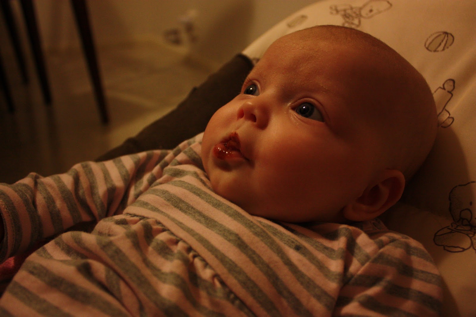 Mutta auta armias ku me tänään sit rohkaistuttiin koittaan peruna-porkkanaa niin naama meni kyllä niin mutruun että huhhuh! Luumu on kaveri, perunaporkkana ei! Mut eikös se niin ole et lapsi tarttee 5-10 maistamiskertaa ennen kuin tottuu makuun? Ja ei siis olla mitenkään syötetty Tiaraa noilla vaan eilen meni ehkä yhteensä yksi teelusikallinen sosetta ja tänään ei varmaan sitäkään kun ei peruna tuonutkaan Tiaralle mukavaa makuelämystä. Kunnolla aletaan sitten maistelemaan kun on ollut 3kk neuvola 28.12. mutta tuskinpa siitä kauheaa haittaa on jos vaikka nyt totutellaan siihen asti näihin kahteen makuun vaikka kerran päivässä. Mutta tässä kuvia meidän pikku maistelijasta: