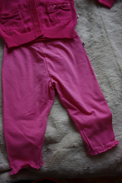 Tämmöset kolahti eilen postiluukusta Oton kummitädiltä ja -sedältä. Aivan kertakaikkisen ihanat ja vielä tismalleen oikeeta kokoakin. Mä rakastuin ton villatakin taskuihin, noi paljetit ja rusetit on ehkä sulosimpia ikinä!