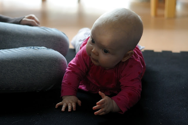 Tiara oli niin väsynyt monen tunnin leikeistä että kun oltiin lähdössä ja puin neitiä ulkovaatteisiin se nukahti sinne kerhon eteisen lattialle. Vauvakerhoilun jälkeen lähdettiin vaunulenkille merenrantaan ja käytiin pikaisella vierailulla Piilo -kirppikselläkin. Piilosta ei tosin tällä kertaa löytynyt oikein mitään meille sopivaa, kaikkea ihanaa kyllä mutta ei oikeassa koossa. Musta tuntuu että tää ikä on silleen aika vaikea kirppisshoppailun kannalta, tuntuu että kaikissa vaatteissa on yläosat sosetahroissa ja alaosista polvet rikki tai kuluneita. Mutta sitten taas niitä vähän isompia vaatteita löytyy paljon enemmän. No jospa me selvitään tästä ikävaiheesta kauppojen valikoimalla ja tehdään niitä löytöjä sitten isompana taas! Yksi löytö pitäis kyllä tehdä, ihan sama kirppikseltä vaiko kaupasta mutta mä haluan ostaa Tiaralle pallon. Tiara leikki eilen eka kertaa elämässään pallolla ja voi että se tykkäsi kovasti! Hankintalistalla siis pehmeä, iloisen värinen ja sopivan kokoinen pallo, vinkkejä, anyone?