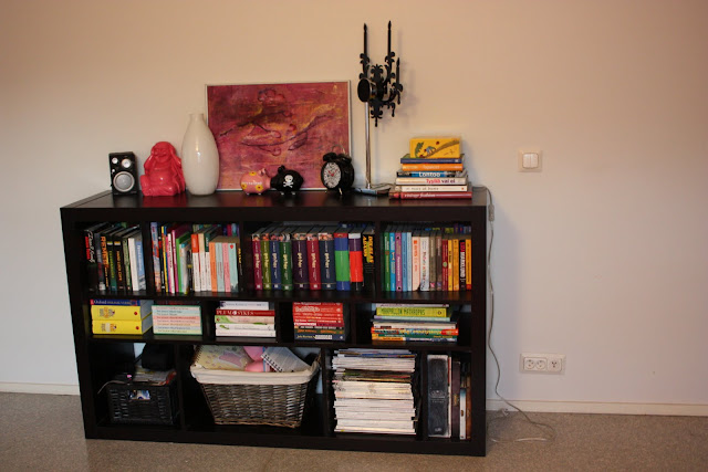 Toi kirjahylly oli siis ennen tuolla nurkassa missä nyt on toi punanen tuoli. Mua alko kyllästyttää ku meil oli vaan kilometrin mittanen tyhjä valkonen seinä ja keksittiin sit että laitetaan tollee vaakatasossa toi kirjahylly siihen nii saa jotain täytettä. Toi vähän vielä tyhjännäköinen nurkka täyttyy kyl sitten kun sinne tulee vauvan sitteri ja puuhamatto ja lisää leluja ym.