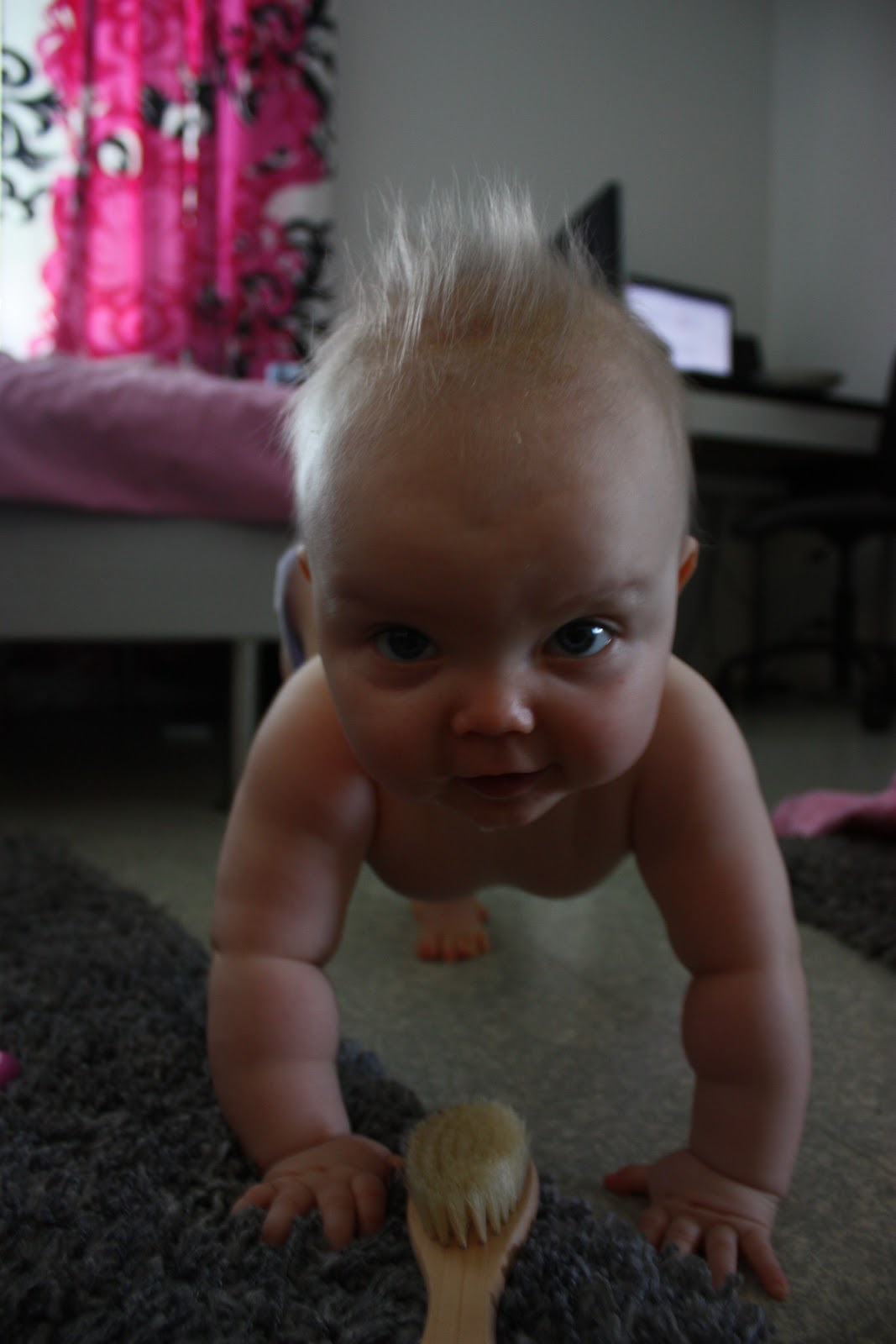 Missä on se äitin seiniä tuijotteleva maidon tuoksuinen pieni paketti, häh?! No tuolla se vipeltää vastaheränneenä (päikkäreiltä) menemään ja paiskoo kirjaa lattiaan. Virtaa riittää heti heräämisen jälkeen siihen asti että silmät väkisin painuu kiinni vaikka vielä vaan pitäis saada leikkiä! On se vain niin rakas ettei mitään järkeä. Huomenna meillä on vihdoin 8kk -neuvola ja neuvolalääkäri joten huomenna päivittelen sitten neuvolakuulumisia ja mittoja, sekä teen perinteisen kuukausipostauksen siitä mitä Tiara osaa, mistä tykkää jne. Nyt mä alan antamaan neidille lounasta jos vaikka sitten päästäisiin ulos nauttimaan ihanasta ilmasta. Mahtavaa alkanutta viikkoa kaikille<3