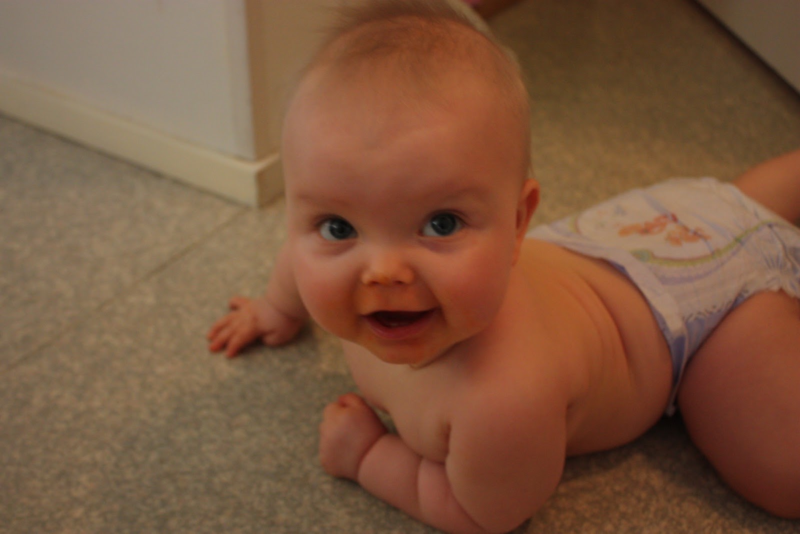 Neuvolalääkäri kehui kovasti Tiaran liikkumistaitoja kun neiti ryömi/yritti kontata/yritti karhukävellä ympäri tutkimushuoneen lattiaa. Kuulemma on ikäisekseen tosi hyvin kehittynyt ja varsinkin kun ottaa vielä huomioon kuukauden ennenaikaisuuden niin kuulemma aivan loistavasti on kehittynyt meidän neiti. Tiara hoki neuvolassa kokoajan ”vauvauvauvauvauväyväyväyväyyy” ja kysyin sitten lääkäriltä siitä että onko se mahdollista että Tiara mahdollisesti jo tarkottaisi sillä ”äidiii”:n hokemisella äitiä oikeastikin ja kuulemma on, eli jee Tiara sitten kai osaa ensimmäisen sanansa? Kyllä se sitä ainakin hokee kun se on tulossa mun luokse tai samalla kun esim. hakkaa mun jalkaa tai rapsuttaa mun käsivartta.
