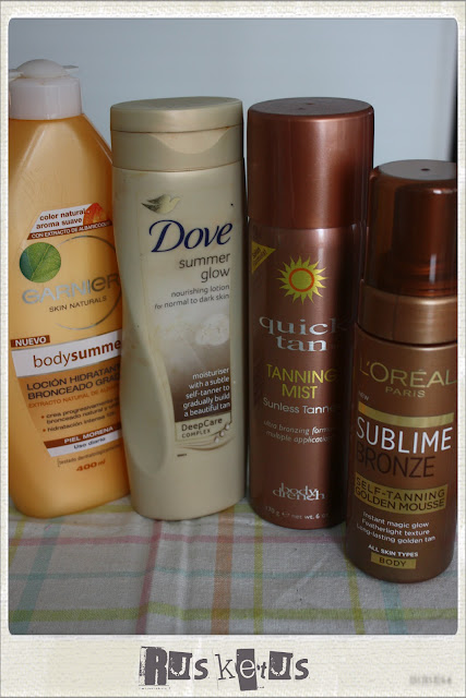 Rusketukseen mulla on vuosien varrella ollut kyllä jos jonkinnäköistä tököttiä, varmaan kahtakymmentä eri itseruskettavaa on tullut kokeiltua. Garnierin bodysummerin neidin Nona-kummitäti toi mulle Ranskasta ja se on kyllä ihan hyvää, tosin väri tulee ehkä turhan hitaasti mun makuun. Doven Summer Glow on kestosuosikki jo vuosien ajalta, mutta ei enää mun ehdoton lemppari koska tuloksia on saatavilla nopeamminkin. Quick Tanin ostin kampaamotukusta ja myyjä sitä mulle suositteli ”ammattilaisten käyttämänä tuotteena”, nojaa, mä en ole ammattilainen mutta sen voin sanoa että toi suihke oli ihan pyllystä! Se ei levittynyt millään ja värisävy oli enemmän porkkanan oranssi kuin ruskea.