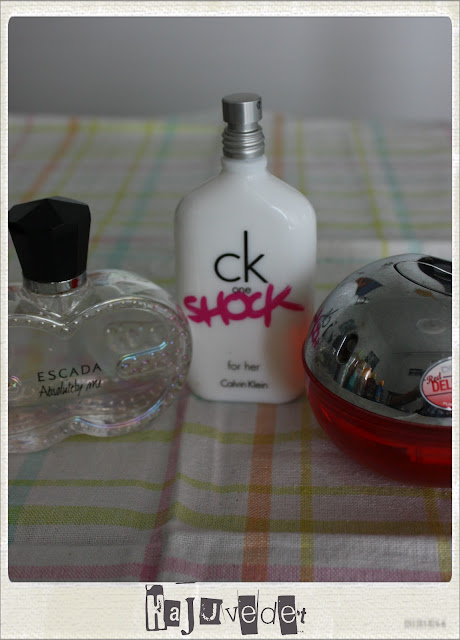 Mulla on paljon hajuvesiä mutta noi kolme on ne joita eniten käytän, eli Escadan Absolutely me, Calvin Kleinin One Shock ja DKNY:n Red Delicious. Toi Calvin Klein oli Oton joululahja mulle ja se on kyllä ollut kovassa käytössä!