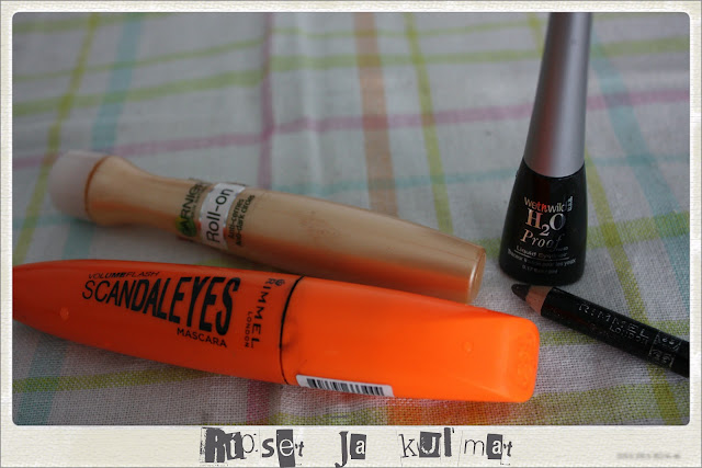 Tässä on tää mun paljonpuhuttu Rimmelin ripsarini, ja yhä edelleen 6viikon käytön jälkeen mä vannon ton nimeen! Ilman tota Garnierin silmäpussinpeittoainetta mä en tulis toimeen mitenkään, toi on kaikkein paras meikkituote mitä voi olla! Mä kannan tota aina mukana ja hätätapauksessa tolla peittää näppylän tai vaikka meikkaa koko naaman. Wet’nwildin vedenkestävä eyeliner on oikeesti pysynyt kyllä ihan hyvin vesisateellakin! Ja toi Rimmelin viimeisiään vetelevä kulmakynä on paras kaveri jo vuodesta 2007!