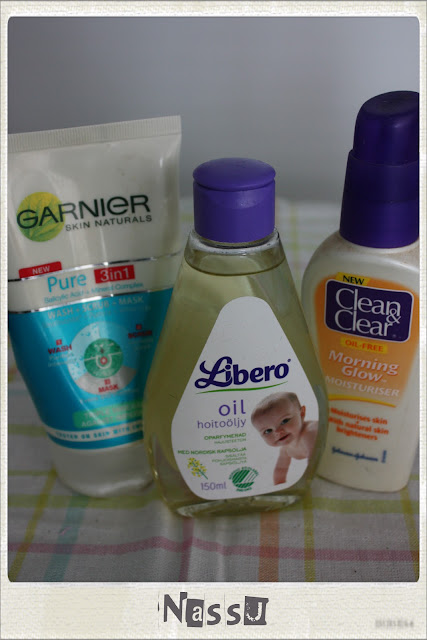 Naaman hoidossa mulla olis todellakin parannettavaa, ja paljon! Mut mä oon ihan järkyttävän laiska ja siksi mä yleensä puhdistan meikit Tiaran pyllypyyhkeillä iltaisin, koska vaihtoehtona ois se että en pesis niitä ollenkaan. Jos mulla on vedenkestävää silmämeikkiä niin putsaan sen myöskin yleensä tuolla vauvaöljyllä. Suihkussa pesen naaman aina Garnierin Pure 3in1:llä joka on ihan parasta! Tulee niin raikas olo ja tosta saa värkättyä kasvonaamionkin nopsasti. Clean&Cleari -sarjaa ei myöskään saa Suomesta mutta toi on tommonen Natusanin kanssa samaan yhtiöön kuuluva halpa markettimerkki. Mut silti, toi voide on ihanan tuoksuista ja piristää aamuisin, nimikin on Morning Glow!