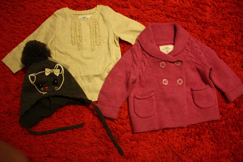 Ollaan tällä viikolla siis ostettu oikeen urakalla niitä pienempiä vaatteita, suurin osa uusista on nyt pesussa ja tietty neidin päällä mut tässä on tän päivän kirpparilöydökset: