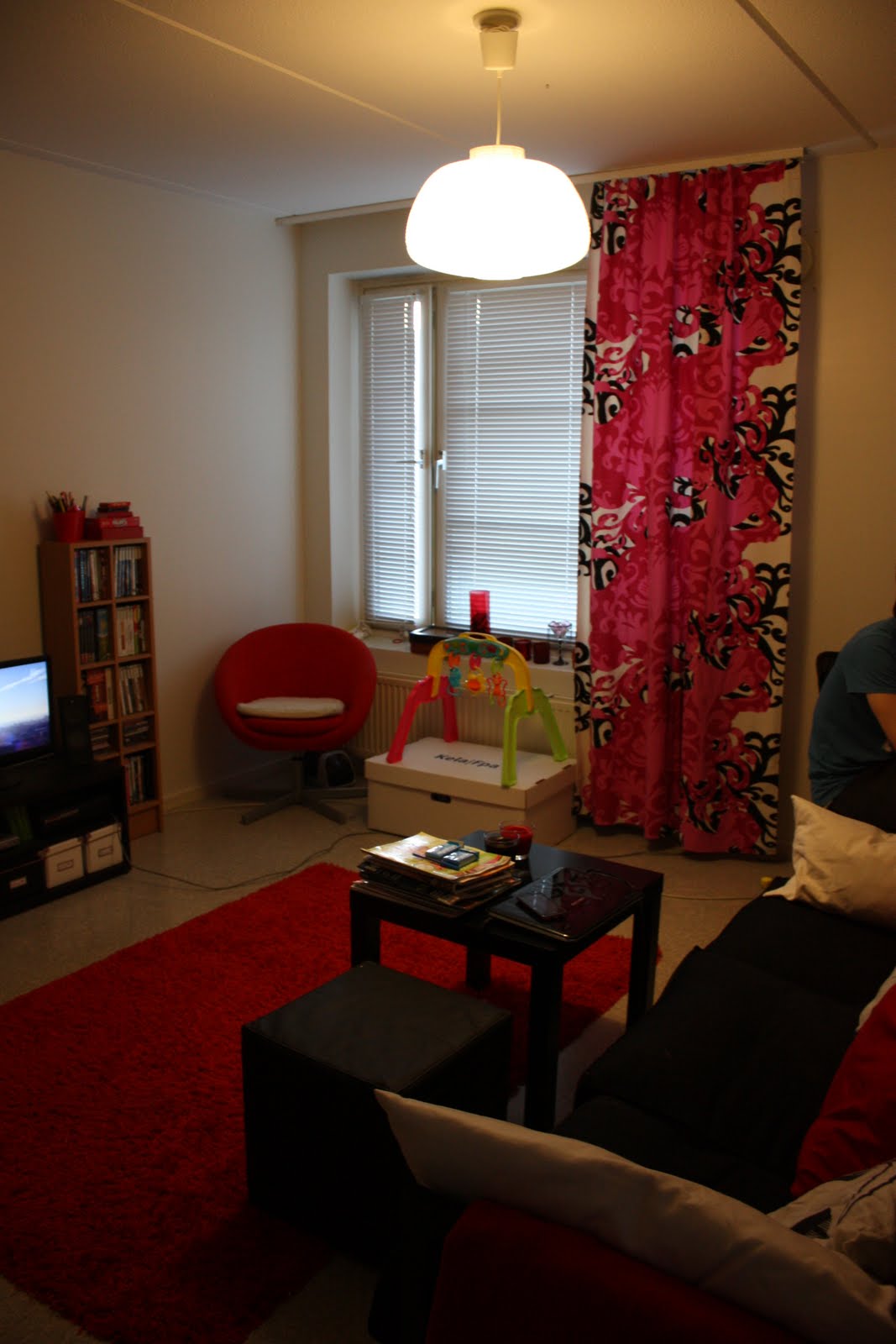 Toi kirjahylly oli siis ennen tuolla nurkassa missä nyt on toi punanen tuoli. Mua alko kyllästyttää ku meil oli vaan kilometrin mittanen tyhjä valkonen seinä ja keksittiin sit että laitetaan tollee vaakatasossa toi kirjahylly siihen nii saa jotain täytettä. Toi vähän vielä tyhjännäköinen nurkka täyttyy kyl sitten kun sinne tulee vauvan sitteri ja puuhamatto ja lisää leluja ym.