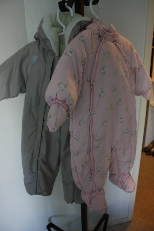 Kahdet toppatöppöset toppapuvun kanssa ja yhdet toppatumput, niiden lisäksi villasukat ja villalapaset