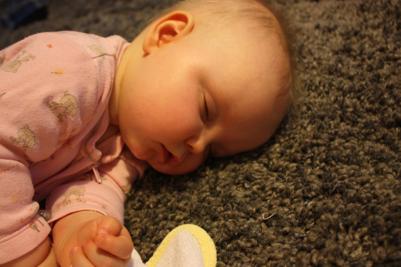 Sunnuntai-iltana kävi ihana juttu, Tiara nukahti lattialle kesken maidonjuonnin, tiedä sitten miksi neiti oli niin poikki! Miten sulonen toinen oli kun siihen kuukahti! Me ollaan yritetty aina nukuttaa Tiara suoraan omaan sänkyyn, mutta monta kertaa viikossa käy niin että Tiara nukahtaa kesken iltapuuron ja sitten vaan kannetaan se sänkyyn. Mutta onneksi Tiara osaa nukahtaa sinne myös itse, eilen sillä oli silmät vielä ihan auki kun vietiin sänkyyn mutta viiden minuutin päästä kun menin kattomaan niin neiti oli kiskaissut peiton korviin ja siellä se nukkua torsotti (ihana ilmaisu!). Mut kattokaa nyt miten sulonen pipana! Tiara myös nukahtaa yleensä aina ilman tuttia, annetaan tutti vaan jos uni ei joskus jostain syystä meinaa tulla tai jos neiti sattuu heräämään johonkin keskellä yötä.