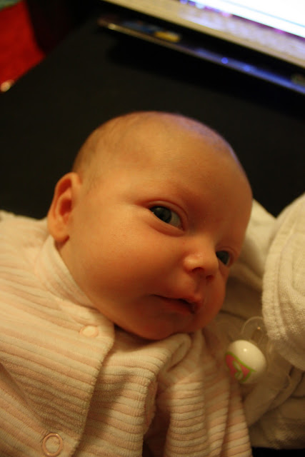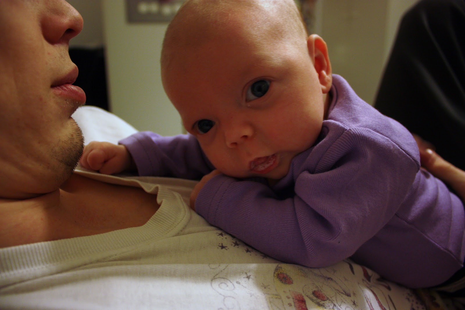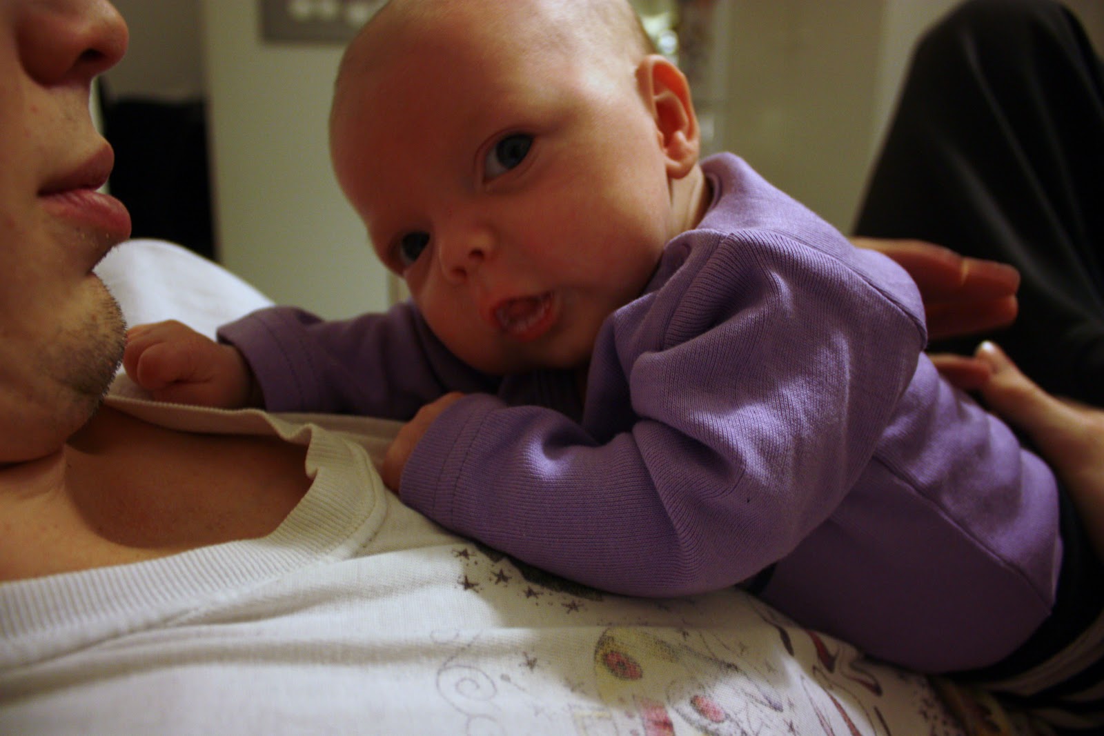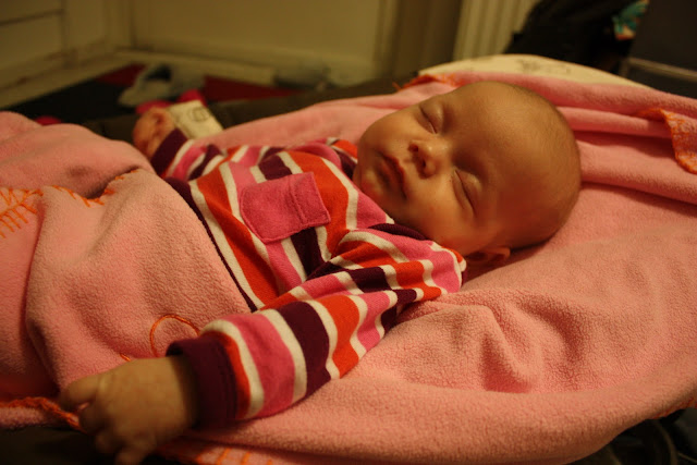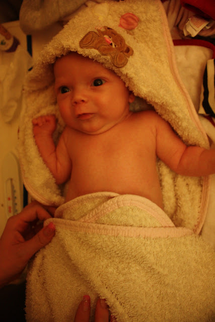 Tulin kaupungilta joskus kuuden jälkeen kotiin ja sen jälkeen hengailin pikkuneidin kanssa kunnes neiti meni nukkumaan. Kylvetettiin pikkuneiti ja vietiin se nukkumaan iltamaidon jälkeen ja hyvin nukahti omaan sänkyyn. Ollaan alusta asti tehty niin et viedään neiti aina sänkyyn iltamaidon jälkeen vaikka oiskin viel silmät auki ja hereillä ja niin se on oppinu sinne nukahtamaan joka ilta. Ehkä kaks? kertaa tän kuuden viikon aikana on käyny nii et pikkuneidil on menny hermo ku ei ookkaan tullu uni ja sit se on tullu viel vähäks aikaa isin ja äidin kaa kattoon telkkarii, mut viimeksi noin on käyny sillon kun neiti oli ehkä 3viikkoinen. Tässä on vielä vähän kuvia pikkuisesta iltapäikkäreillä ja kylvyn jälkeen:
