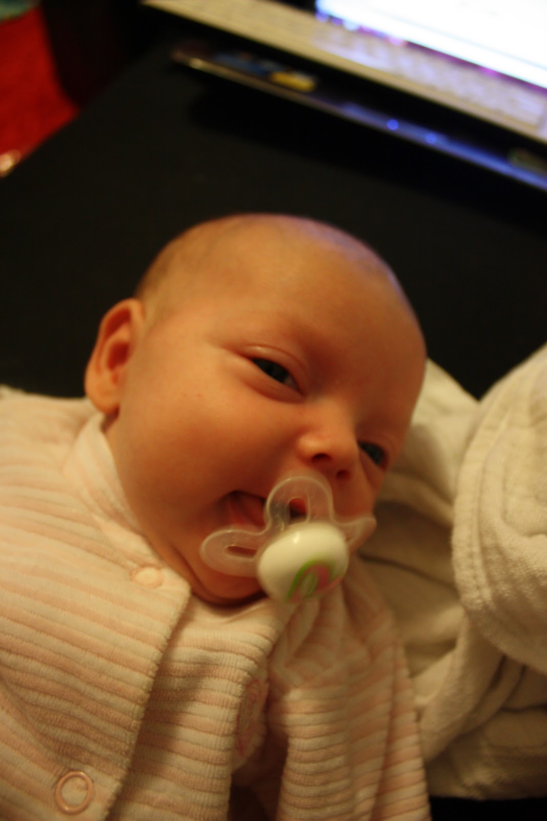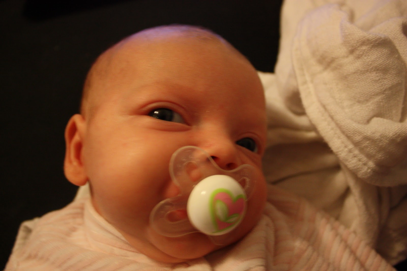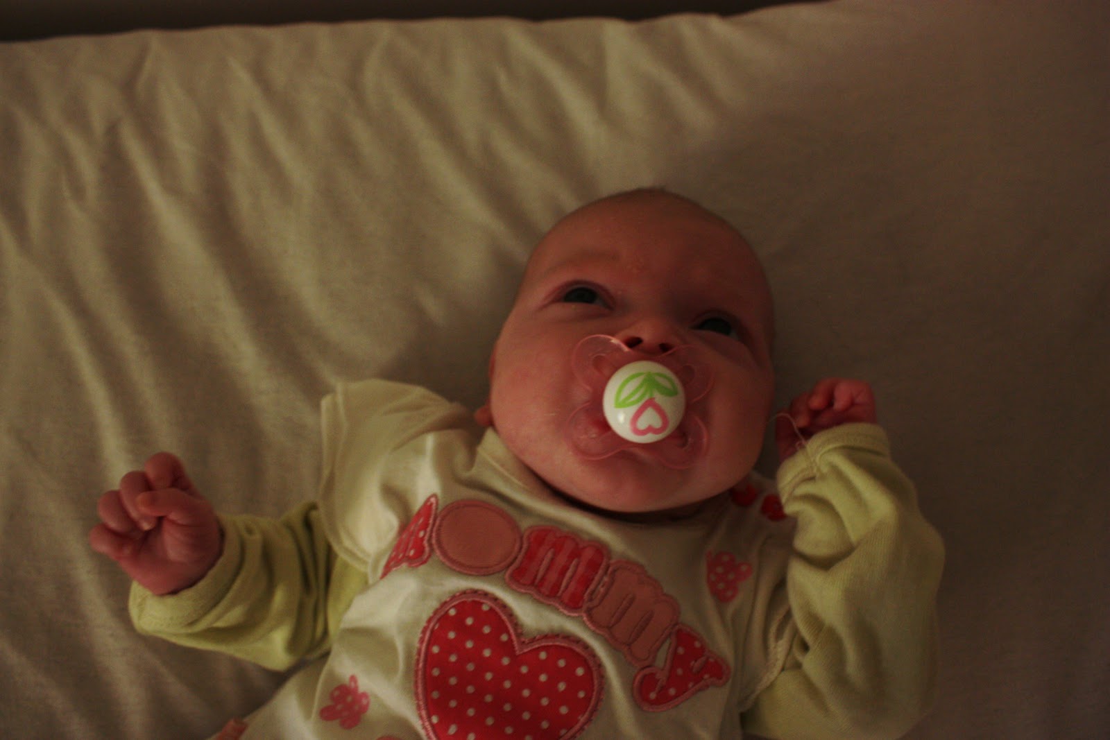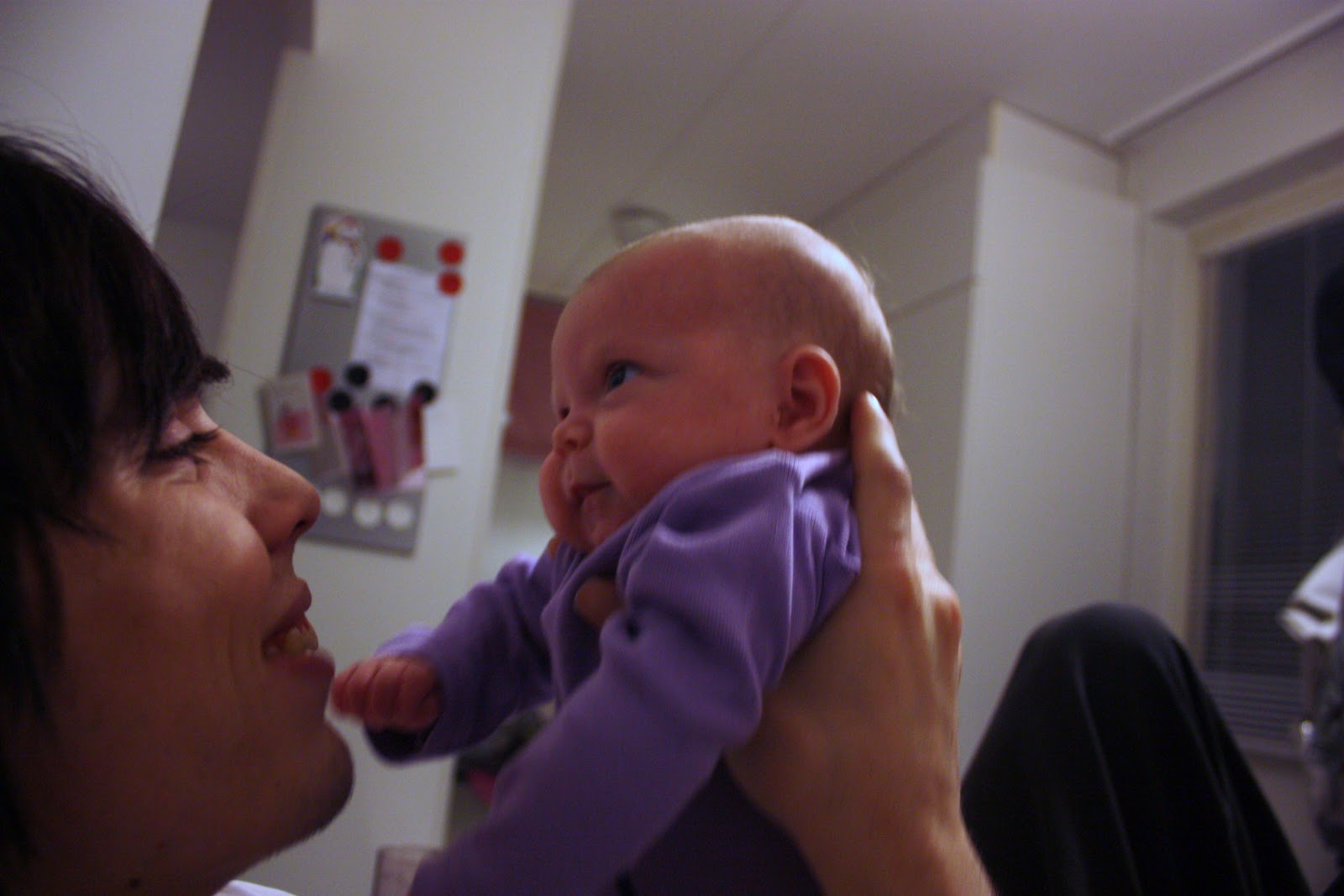 Hyvin olivat kuulemma pärjänneet Otto ja pikkumuru ja neiti oli esitelly mun poissaollessa isille monta kertaa uutta taitoaan jonka tänään oppi, nimittäin hymyilyä! Kerkesin onneksi itsekin aamulla todistaa pikkuneidin ekan hymyn ja täytyy sanoo et oli ehkä sulosinta mitä ikinä oon nähny. Se oli vaan niin hauskaa kun isi sano ilosella äänellä ”MOI!” että oli pakko hymyillä. Ihana muru♥ Pikkuinen teki tänään aamulla toisenkin söpön jutun; Neiti makoili tossa meidän kakkossängyllä ja menin hetkeksi olkkariin hakeen rättiä tai jotain niin sillä aikaa pikkuinen oli ottanu itse tutin pois suusta ja piti sitä tiukassa otteessa kädessään. Ihmeissään tuijotteli tuttia kun se oli niin jännä!