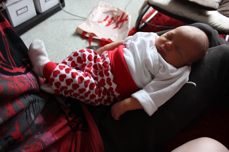 Tänään aamulla ylläriylläri nukuttiin pommiin ja kerkesin vaan just ja just käydä suihkussa ennen ku neuvolatäti pimpotti ovikelloa. Syy pommiin nukkumiseen on siinä et pikkuneiti ekaa kertaa valvotti meitä yöllä, aamuviidestä kaheksaan neiti ähisi ja kitisi, ei itkeny ollenkaan mut ei myöskään nukahtanu ja sillon jos pikkunen ääntelee nii en mäkään pysty nukkumaan.. Mut kahdeksalta sit syötettiin pikkunen uudestaan nii johan se simahti ja nukkukin sit niin hyvin et ei meinannu herätä ollenkaan vaik neuvolatätiki tutki.