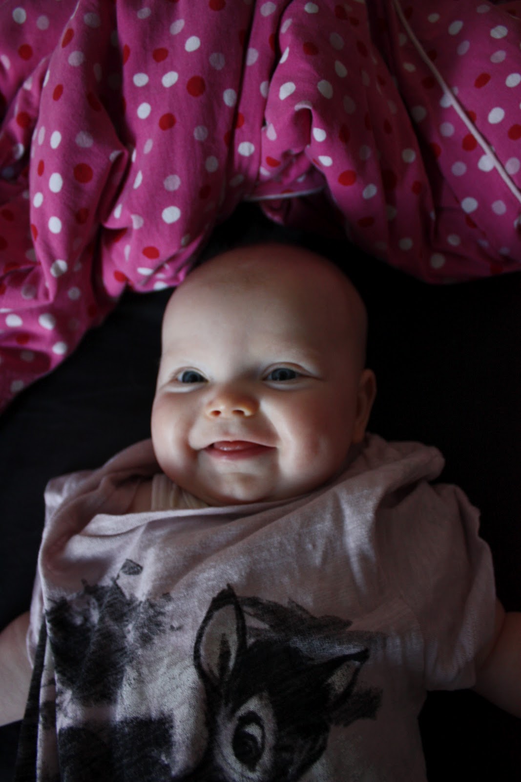 Meil on ollu kyl ihan paras viikonloppu pitkään aikaan! Ihan oikeesti, ollaan naurettu vedet silmissä tolle meidän ipanalle joka on maailman ihanin mölyapina! Mä luulin ennen et Tiara oli äänekäs ku meille sanottiin neuvolassa jo kaks kuukautta sitten että Tiara ääntelee tosi paljon, mut siis nykyään toi on aivan toista luokkaa. Tiara huutaa ja nauraa ja hihkuu ja mölisee muutenvaan, ihan kokoajan!  Tiaran rauhallinen iltahetki; yökkäreiden vaihtokin muuttui äsken vuosisadan hauskimmaksi leikiksi kun isi erehty vähän kutittamaan ja Tiaran kiljunnasta innostuneena jatkoi sitten kutitusta, saapa nähdä mihin aikaan illasta Tiara on rauhottunut tarpeeksi sen huutonauruhepulikohtauksesta, yleensä kun tähän aikaan meillä on valot pimeenä ja Tiara syö tuttia peiton kanssa sitterissä ja odottelee iltavelliä.