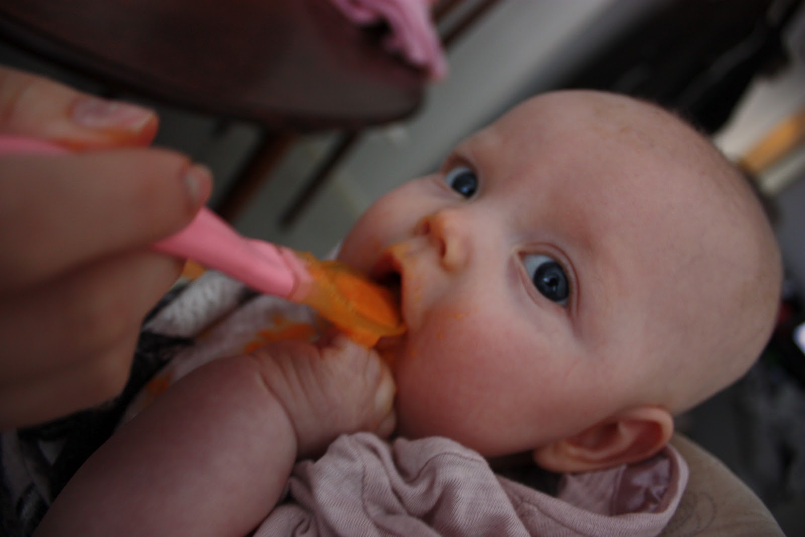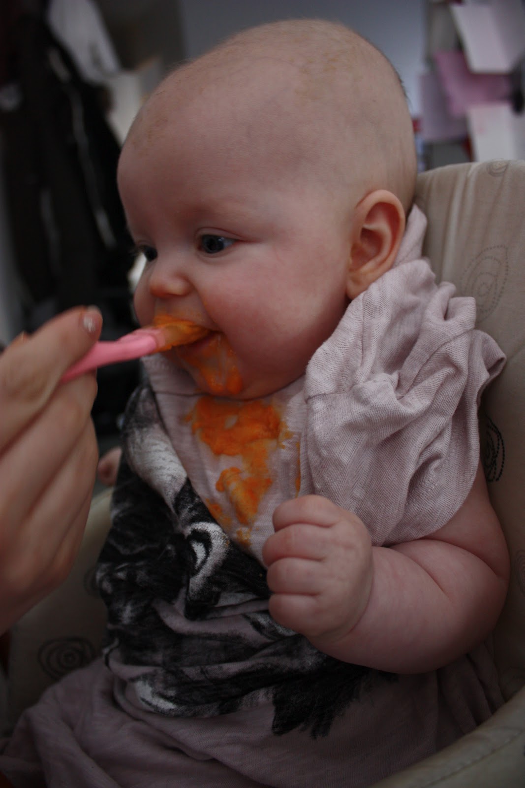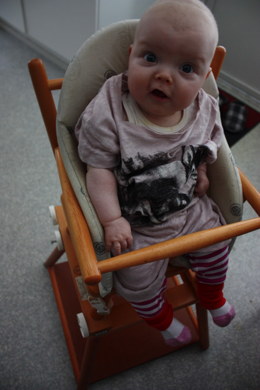 Perjantaina äiti toi sen syöttötuolin meille. No sitä ei olla saatu vielä maalattua, tietenkään. Ei me koskaan saada mitään aikaiseksi ihan heti, mutta eipä sen ole niin väliäkään. Mainiosti neiti näytti tuolissa viihtyvän naurusta ja selkeästi helpottuneesta soseensyönnistä päätellen. Sose näyttää olevan nyt suurta herkkua ja neiti oikeen avaa suun apposen ammolleen kun lusikka lähestyy! Jes! Ja turhaan mä huolehdin siitä että Tiara ois vielä liian pieni siihen tuoliin, niin terhakkaana se siinä istuskeli että enää ei epäilytä ollenkaan.