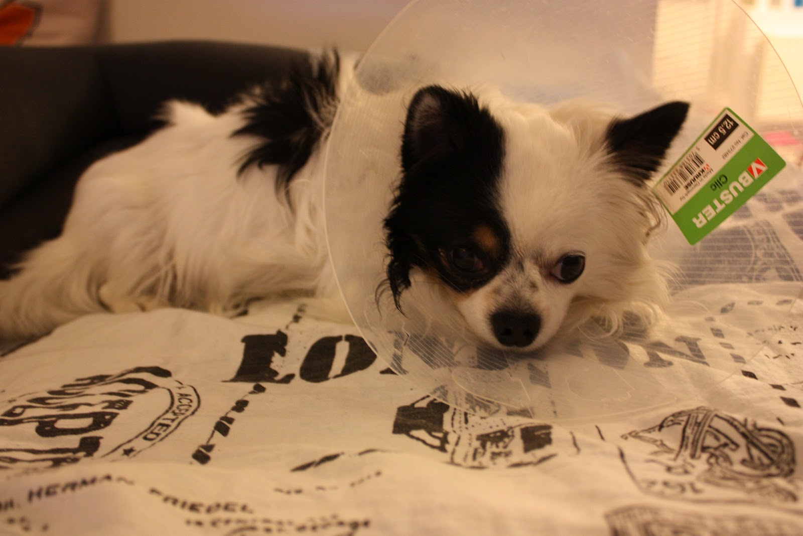Meidän karvapallero<3 Raukka ku joutuu pitään tota tötsää päässä 🙁