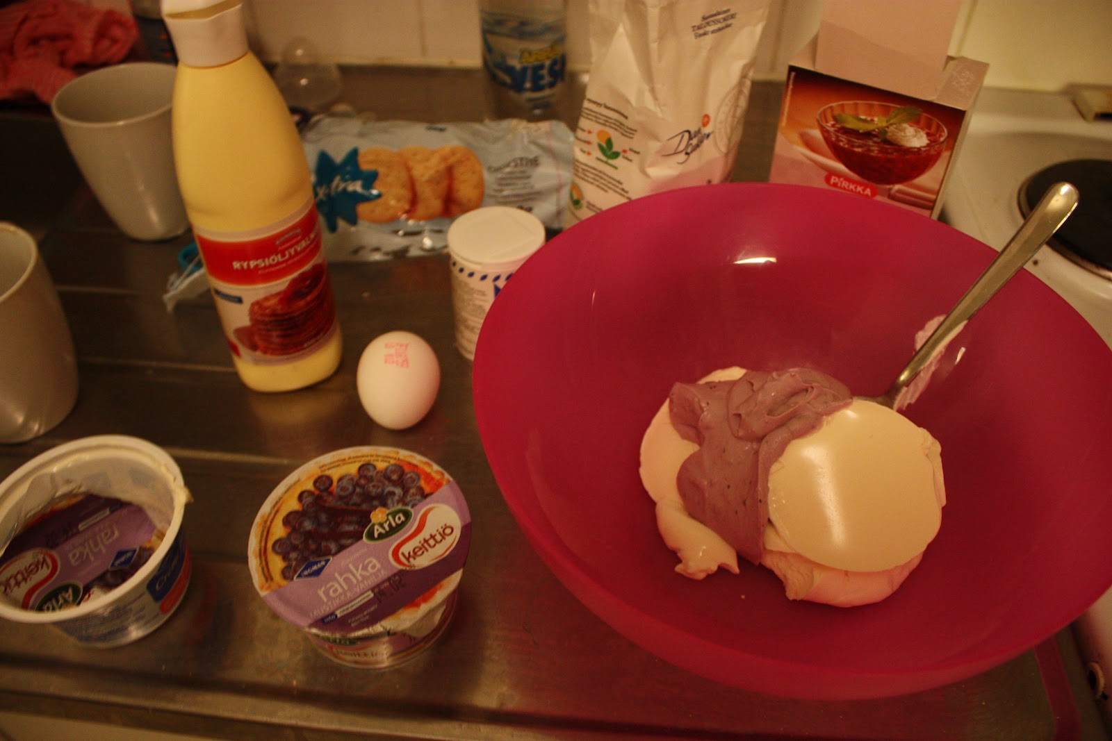 Ruuasta puheenollen, käytiin eilen Kampin Memphisissä syömässä ja oli kyllä ihan mielettömän hyvää sapuskaa. Mä otin Halloumi-burgerin vaikken yleensä koskaan tilaa kasvisruokaa mutta oli kyllä loistava päätös, se oli nimittäin ihan törkeen hyvää! Oli ihana käydä ravintolassa syömässä ja viettää vapaapäivää ruuanlaitosta. Tänään sitten innostuttiin ja leivottiin juustokakkua, tällä kertaa vanilja-mustikkarahkatäytteellä, mutta muuten samalla ohjeella kuin viimeksi. Tuli tosi hyvää kakkua ja toi ohje on niin ihanan helppo, ja helppoa on myös sen muuntelu; vaihtaa vaan eri makuiseen rahkaan ja avot!