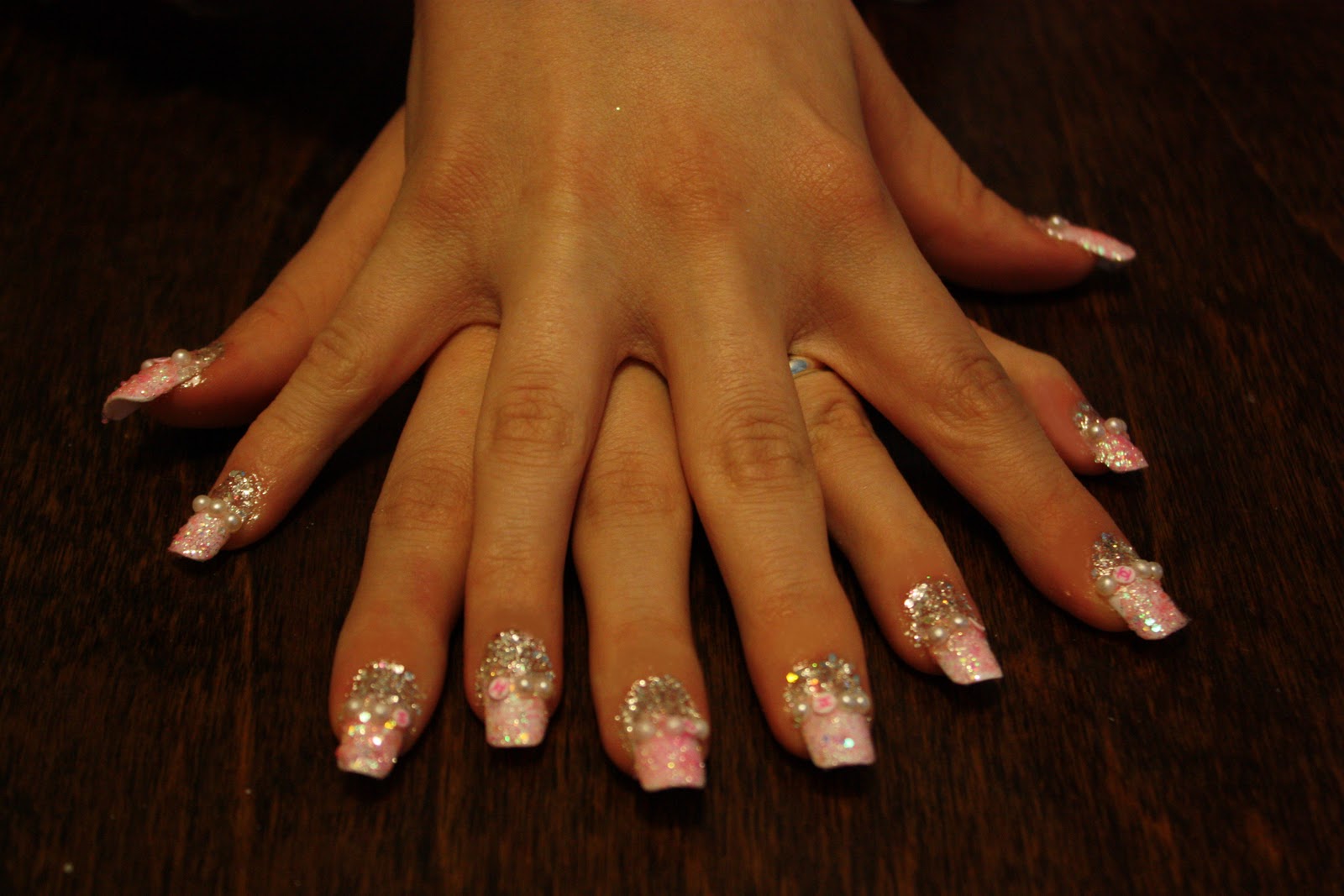 Kynsiin tuli siis hopeaa ja vaaleanpunaista glitteriä ja tippirajoihin valkoisia helmiä ja pinkkivalkoisia minikokoisia Chanel -logoja jotka tarkkasilmäiset ehkä bongaa! Tässä kuvassa kynnet ei oo vielä ihan asettuneet joten glitteriä on vähän sikinsokin, mutta nyt glitteriä on enää sille kuuluvissa paikoissa. Aika blingblingiä vaihteeksi, mut tykkään ihan sikana! Ei tartte muuten olla nii glamour ku on blingit kynsissä, pientä luksusta pyjamapäiviinkin!