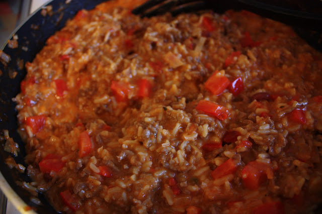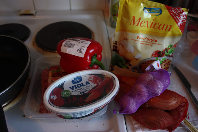 Ruskista jauheliha pannulla. Pilko sipulit, valkosipuli, chili ja paprika. Lisää pannulle jauhelihan joukkoon ja paista vielä hetki. Lisää vesi ja kun vesi kiehuu, lisää pata-ainekset kokoajan sekoittaen. Keittele hiljalleen n. viisi minuuttia ja lisää sitten tuorejuusto. Keitä vielä toiset viisi minuuttia, anna vetäytyä hetki ja tarjoile!