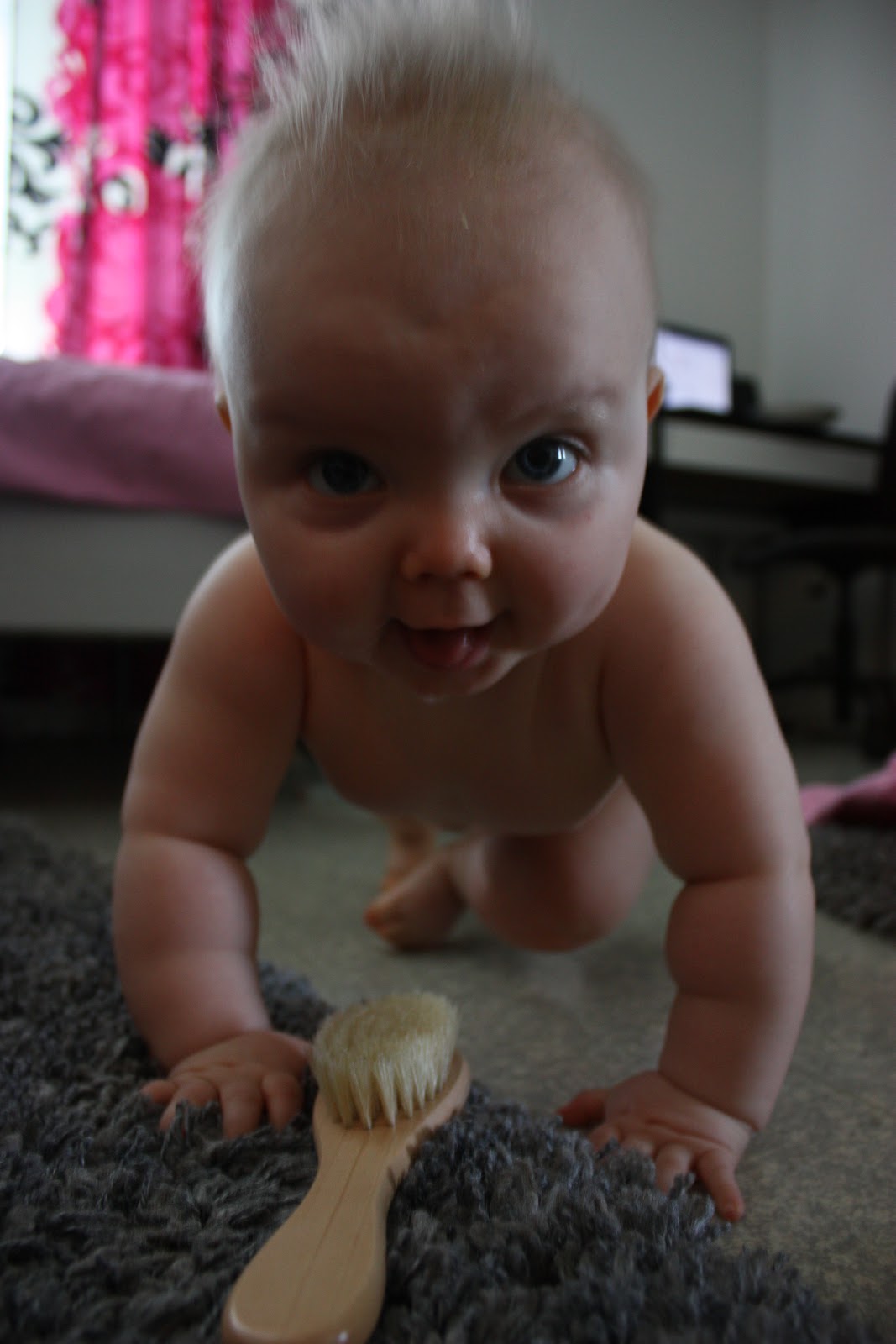 Tiaran tukka on kasvanut aivan älyttömästi ja mulla kiiluu jo pinkkien pinnien ja pompuloiden kuvat silmissä. Varmaan noihin saisikin jo pienen pinnin kiinni, mutta mä haluan odottaa vielä vähän aikaa kun toi tukka tuntuu niin hentoiselta eikä kumminkaan ole mitenkään Tiaran silmillä/muuten tiellä vielä. Katsokaa nyt mikä ihana punnertava pörröpää!
