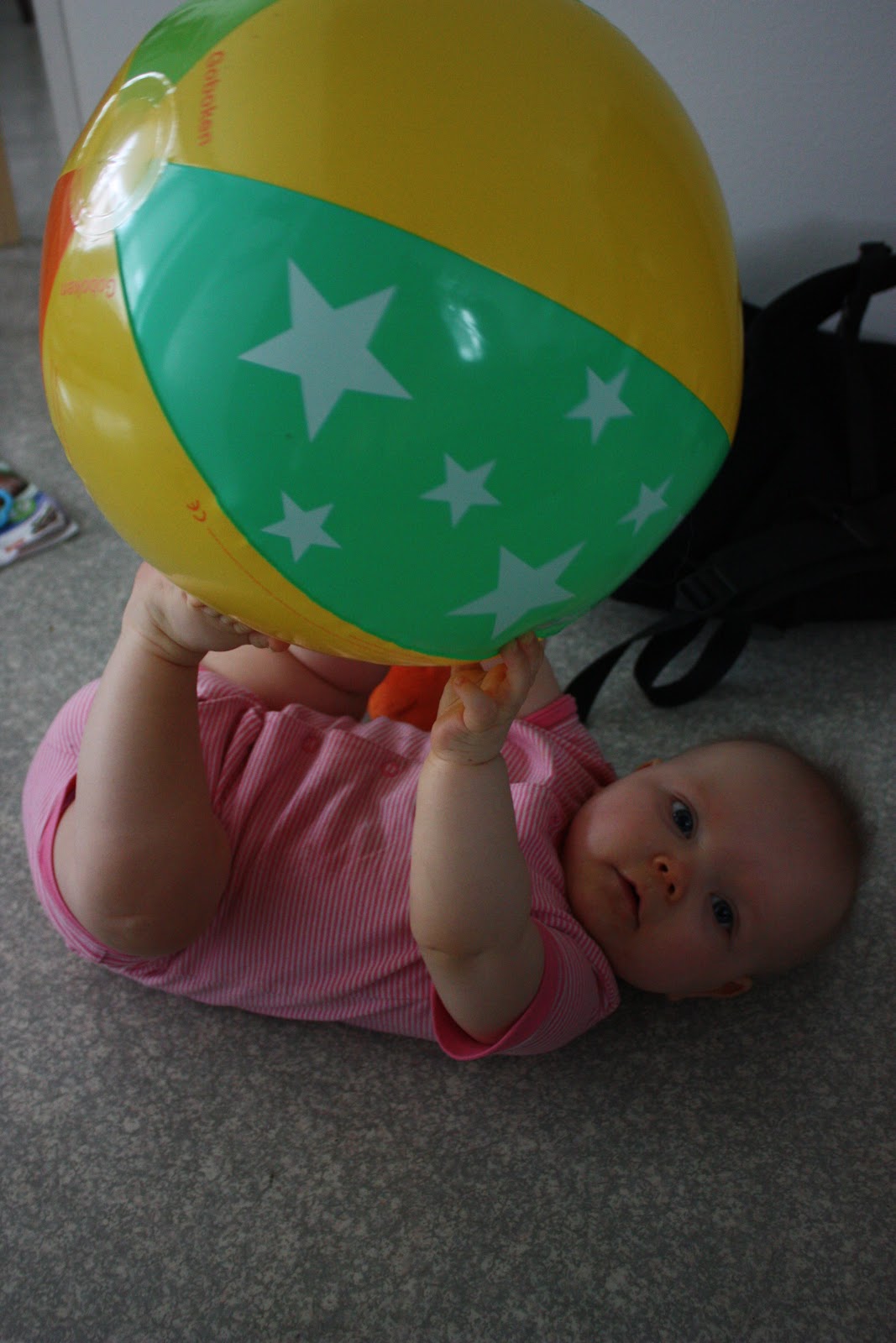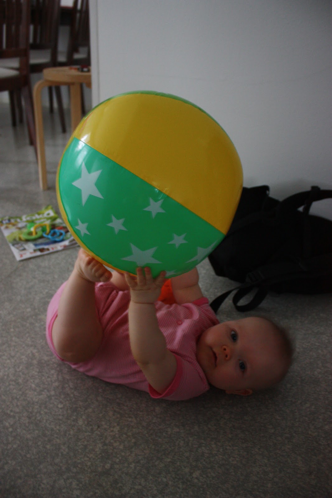 Tiara on myös tutkimusmatkaillut ahkerasti ja vieraillut pöytien alla, kirjahyllyssä, lelulaatikossa ja sängyn alla. Varmasti monissa muissakin paikoissa, mutta kaikesta en ole ehtinyt nappaamaan kuvaa! Tiara on myös ihan totaalisen rakastunut tuohon vau-kirjakerhosta saatuun rantapalloon, sen kanssa saa kyllä ajan kulumaan ja ihanat naurunräkätykset vain raikaa.