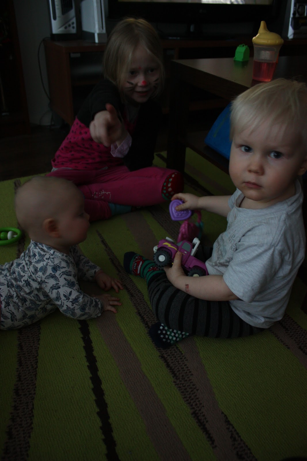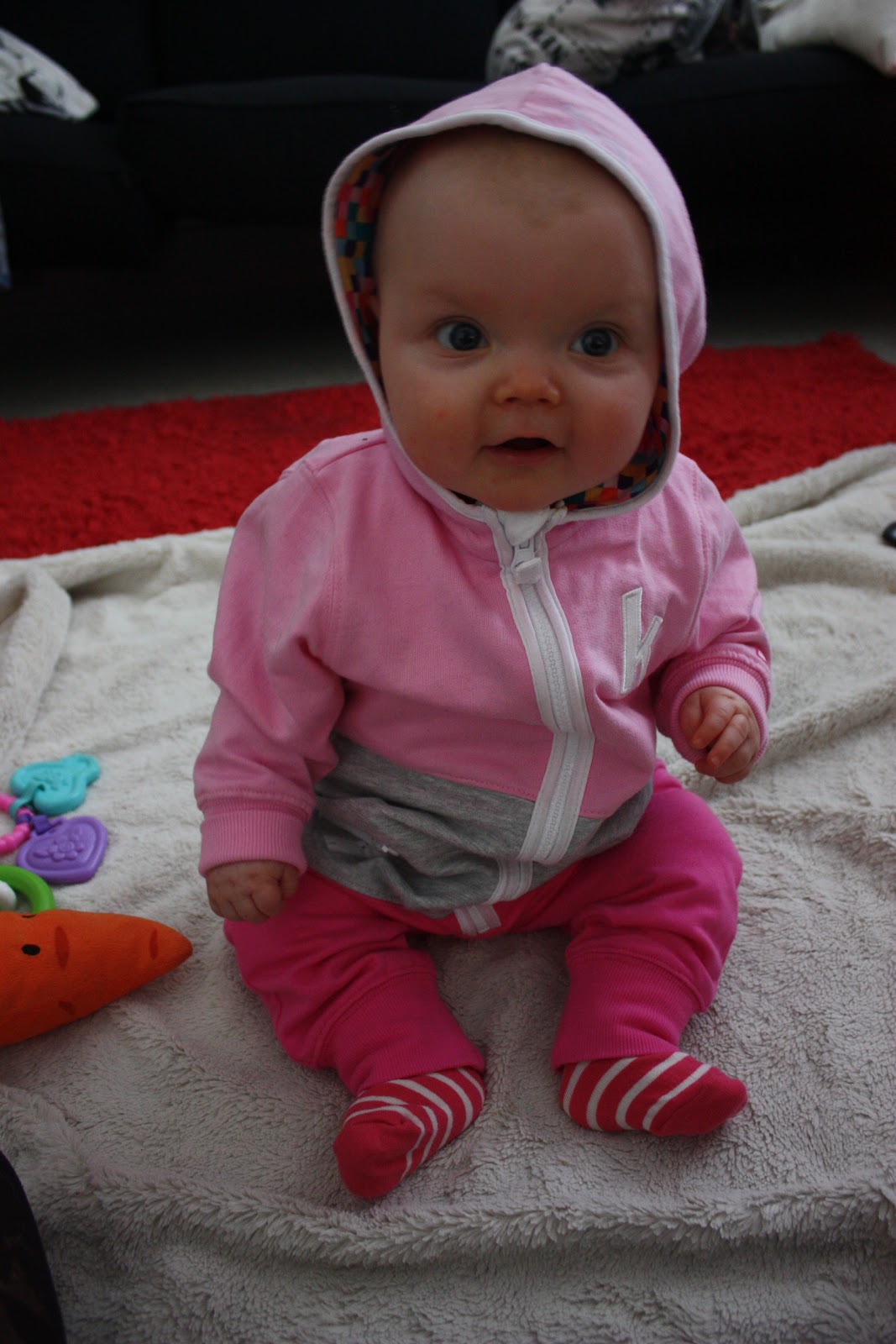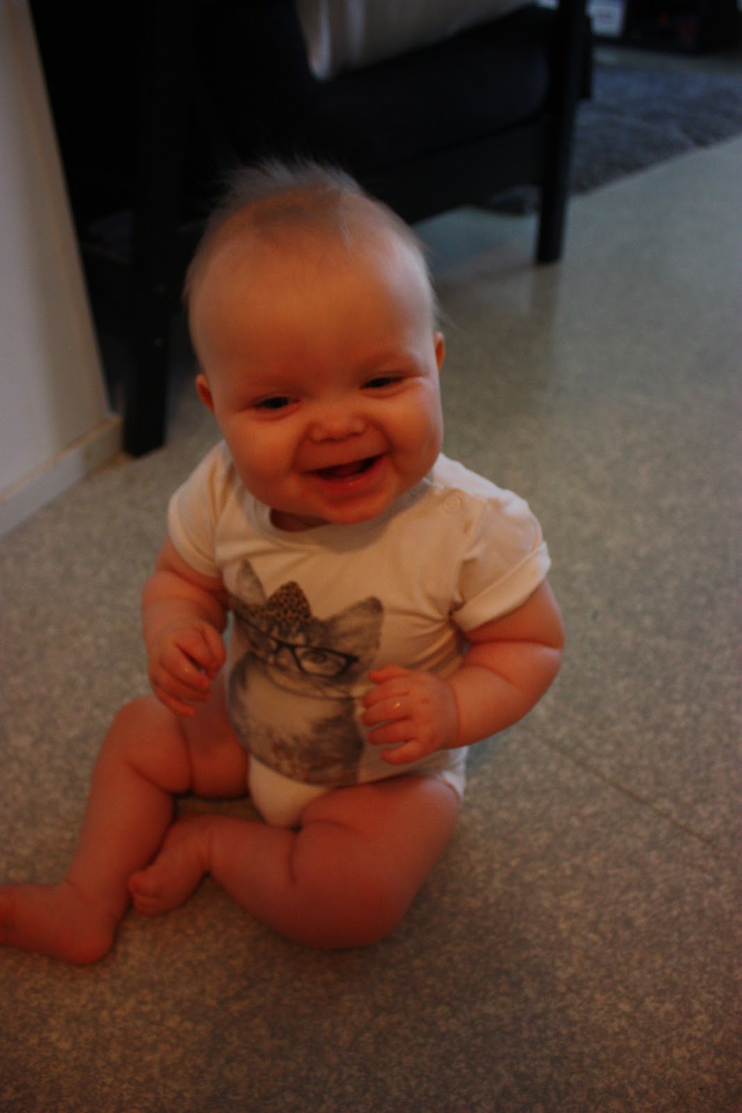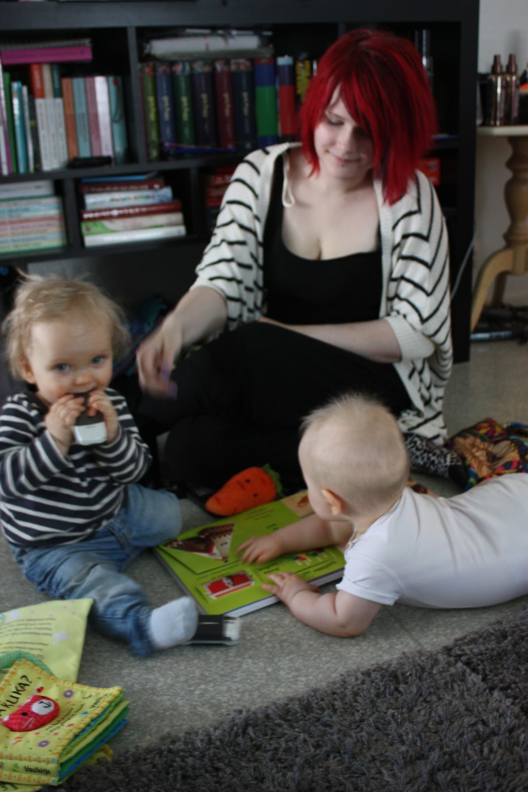 Pakko tähän loppuun vielä kertoa, että lasten kasvatus on kivuliasta puuhaa! Mä makoilin äsken lattialla ja puhuin äidin kanssa puhelimessa niin eiköhän Tiara tarrannut mua silmästä ja hiuksista kiinni ja nousi polvilleen kun se yritti ottaa multa puhelinta! Ja sitten kun sanoo että ”Ai ai äitiä sattuu, ei saa” niin saa vain räkäiset naurut palkaksi, nice! Kyllä mä sen ymmärrän ettei noin pieni tosiaankaan vielä tiedä että se voi satuttaa toista ja kyllä nyt naurattaa itseänikin mut äsken kyllä sattui. Mut on se silti ihana neiti,