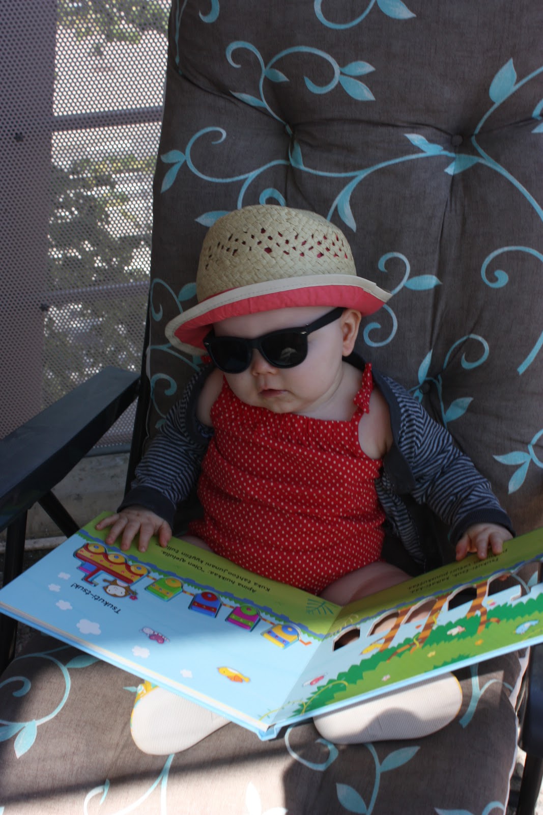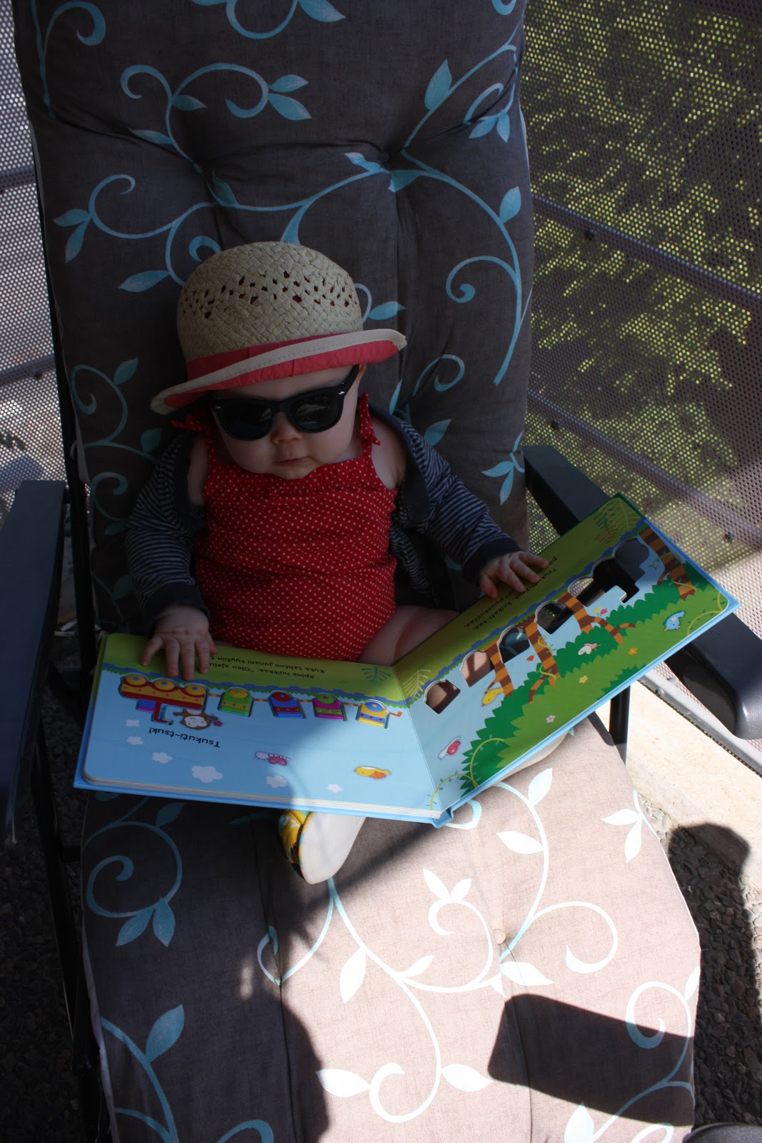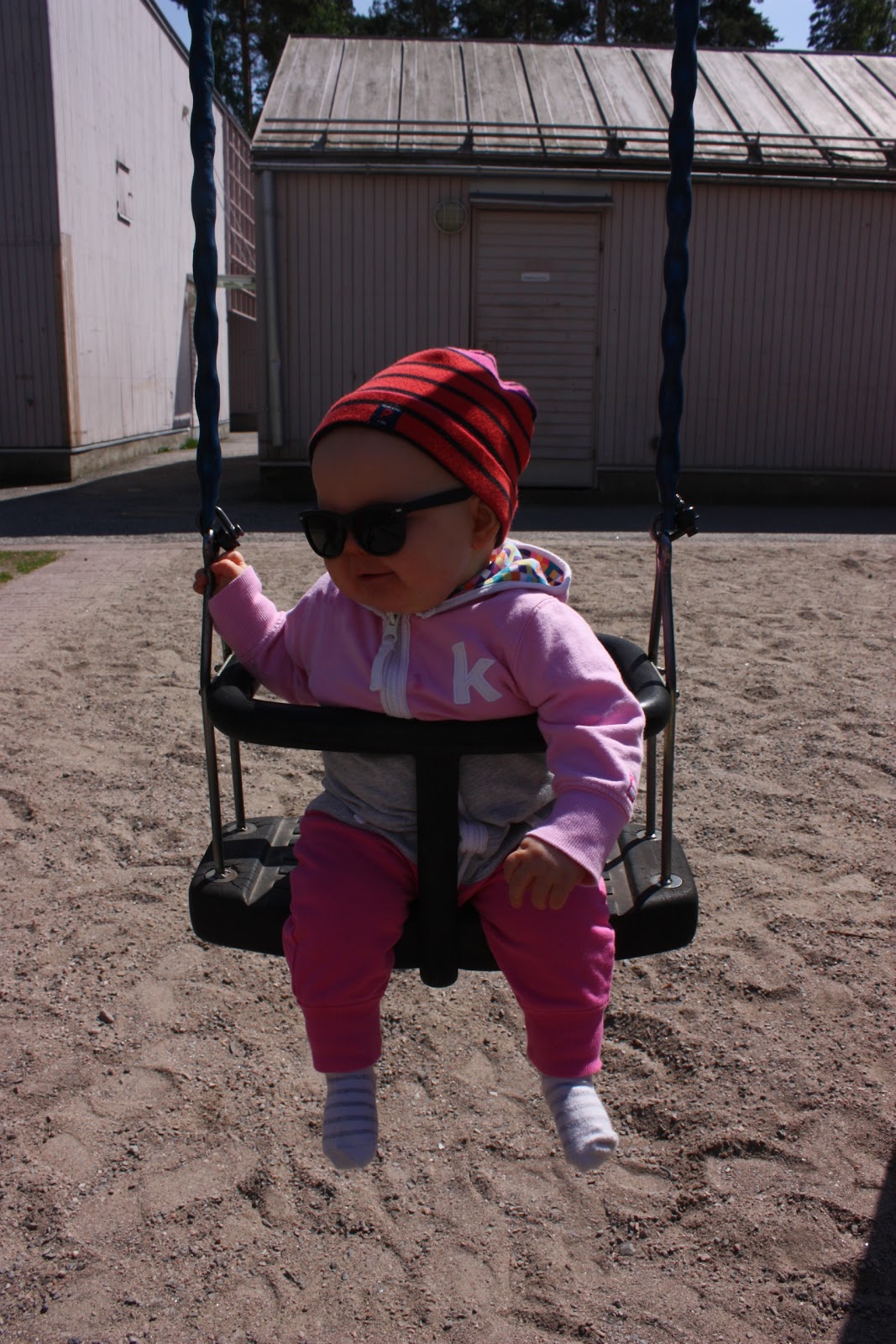 Ollaan myös käyty paljon ulkoilemassa ja keinumassa kun on ollut hyvät ilmat ja on se niin ihanaa kun näkee miten kovasti Tiara nauttii niinkin yksinkertaisesta asiasta kuin keinuminen, se varmaan istuis siinä keinussa vaikka koko elämän putkeen jos antaisin. Ikinä ei ole vielä keinussa neiti osoittanut kyllästymisen merkkejä!Torstaina oli vielä sen verran viileä tuuli että piti laittaa college-haalari päälle mutta eilen nautittiin lämmöstä sitten senkin edestä! Eilen ei tosin valitettavasti päästy keinumaan kun vittusaatanaa hokevat varhaisteinit olivat kansoittaneet meidän keinupaikan, mutta me mentiin sitten partsille lukemaan kirjaa ja oli sekin mukavaa! Tässä parit ulkoilu -kuvat eiliseltä ja torstailta: