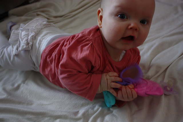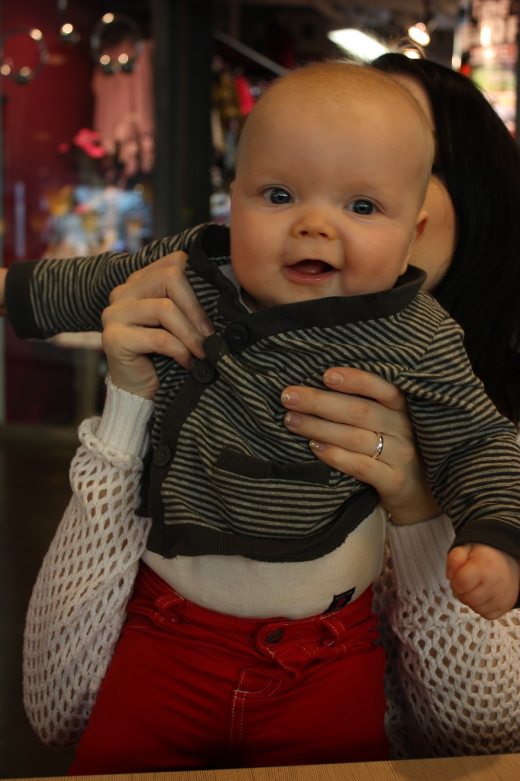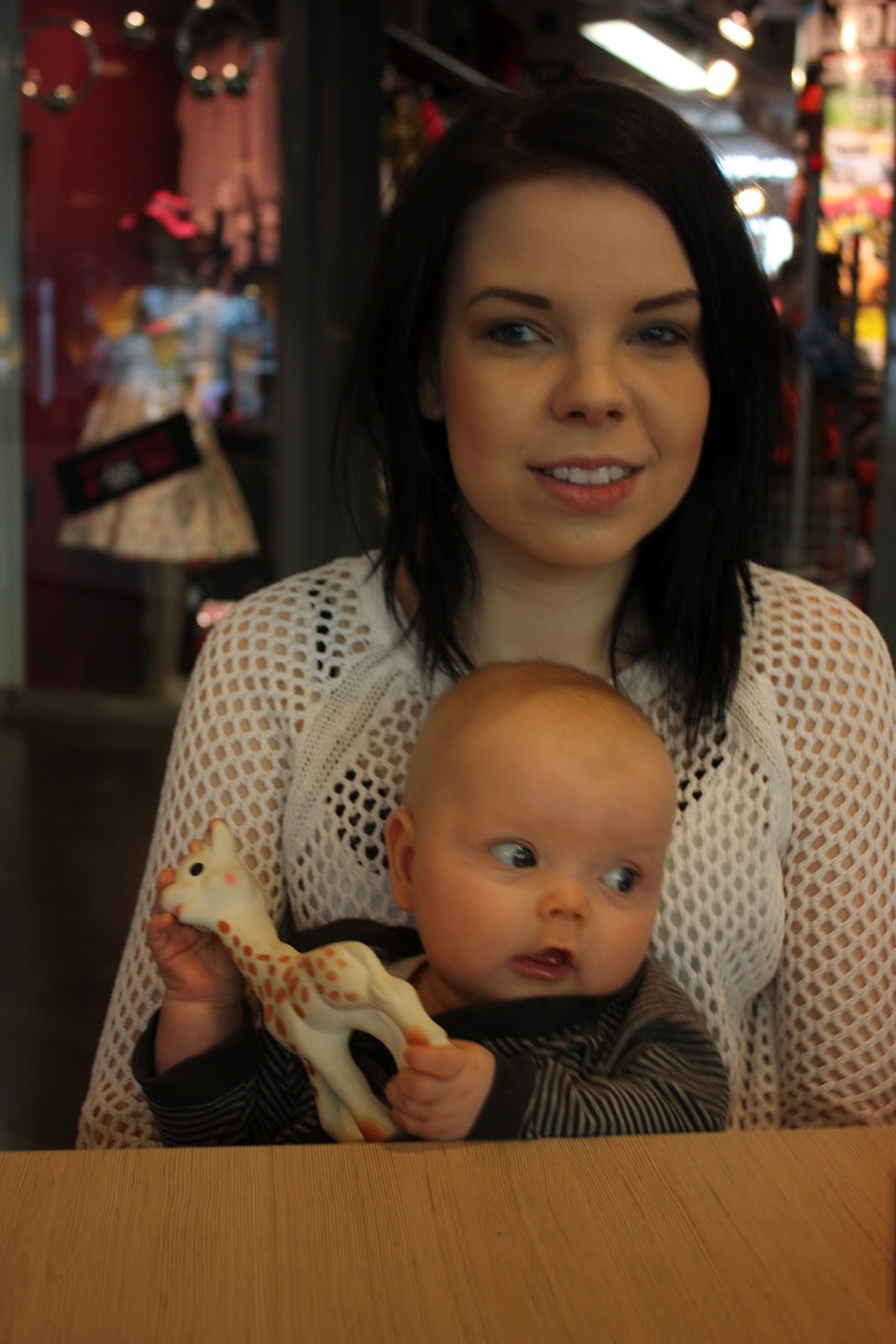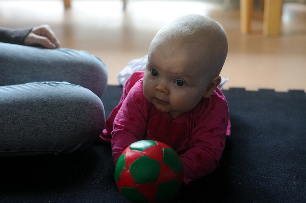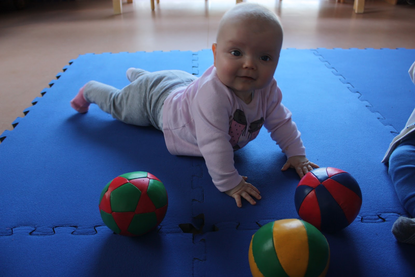 Tiara oli niin väsynyt monen tunnin leikeistä että kun oltiin lähdössä ja puin neitiä ulkovaatteisiin se nukahti sinne kerhon eteisen lattialle. Vauvakerhoilun jälkeen lähdettiin vaunulenkille merenrantaan ja käytiin pikaisella vierailulla Piilo -kirppikselläkin. Piilosta ei tosin tällä kertaa löytynyt oikein mitään meille sopivaa, kaikkea ihanaa kyllä mutta ei oikeassa koossa. Musta tuntuu että tää ikä on silleen aika vaikea kirppisshoppailun kannalta, tuntuu että kaikissa vaatteissa on yläosat sosetahroissa ja alaosista polvet rikki tai kuluneita. Mutta sitten taas niitä vähän isompia vaatteita löytyy paljon enemmän. No jospa me selvitään tästä ikävaiheesta kauppojen valikoimalla ja tehdään niitä löytöjä sitten isompana taas! Yksi löytö pitäis kyllä tehdä, ihan sama kirppikseltä vaiko kaupasta mutta mä haluan ostaa Tiaralle pallon. Tiara leikki eilen eka kertaa elämässään pallolla ja voi että se tykkäsi kovasti! Hankintalistalla siis pehmeä, iloisen värinen ja sopivan kokoinen pallo, vinkkejä, anyone?