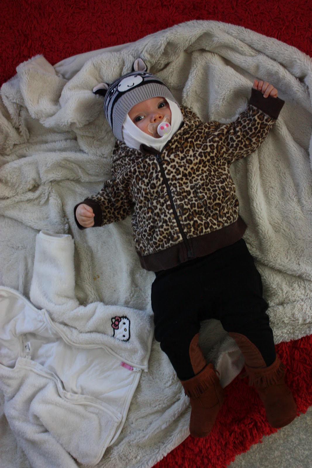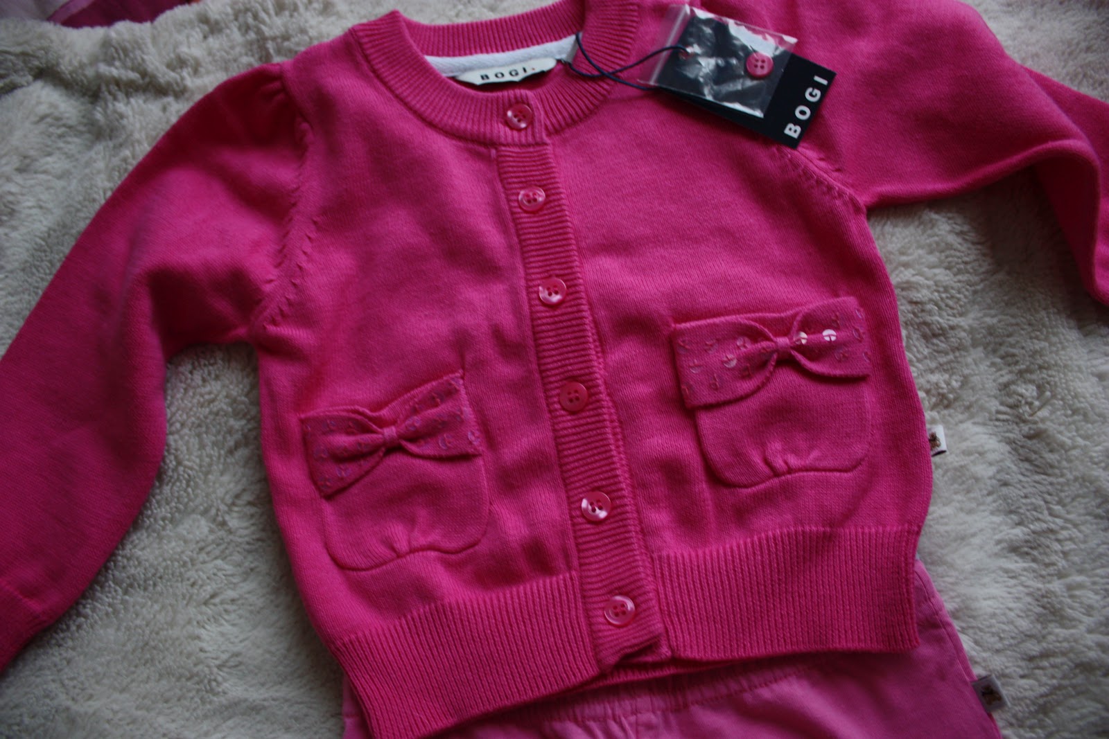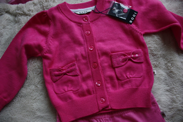 Tämmöset kolahti eilen postiluukusta Oton kummitädiltä ja -sedältä. Aivan kertakaikkisen ihanat ja vielä tismalleen oikeeta kokoakin. Mä rakastuin ton villatakin taskuihin, noi paljetit ja rusetit on ehkä sulosimpia ikinä!